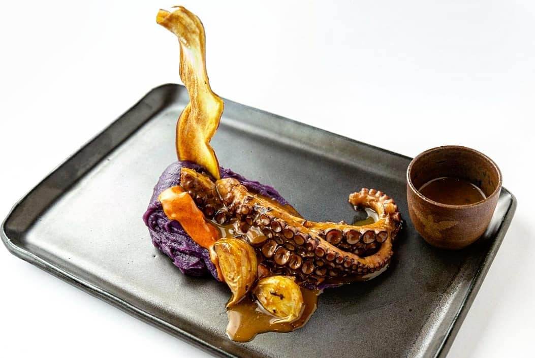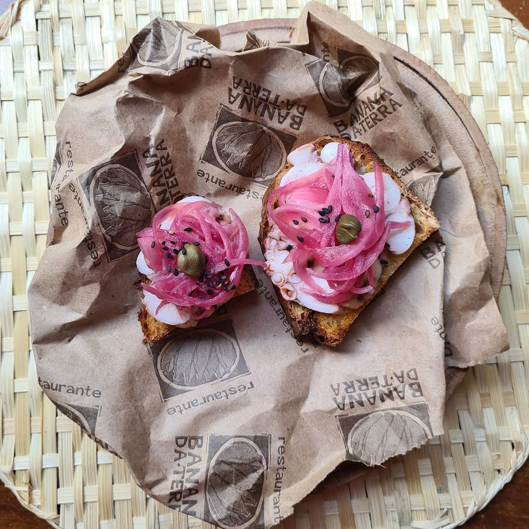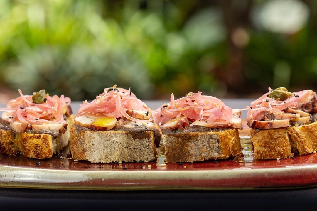 - 🐙 polvo em lâminas sobre tapenade e picles de cebola roxa picante sobre pão