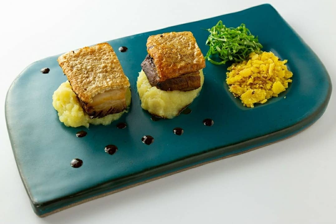 - 🐷 barriga de porco pururuca, pure de abacaxi, molho de porco, farofa de farinha de milho e couve