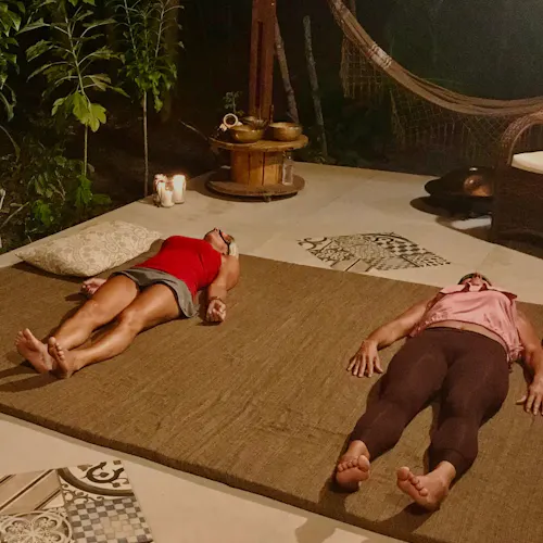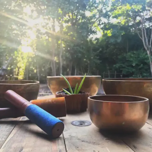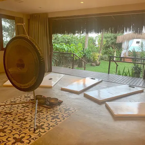 Em uma postura confortável, começa o momento de relaxamento onde você estará pronto para uma conexão interna ouvindo a música dos gongos junto com as vozes da natureza e sentindo a vibração das tigelas tibetanas em contato com seu corpo.
