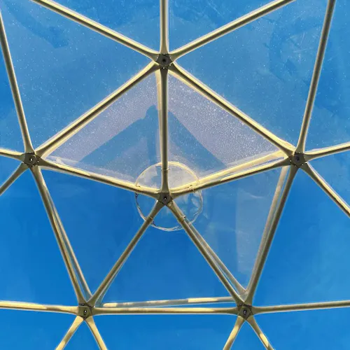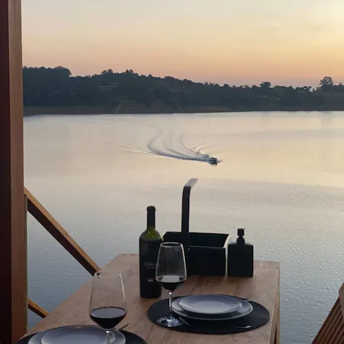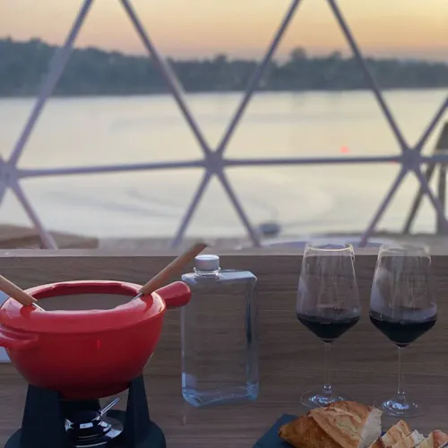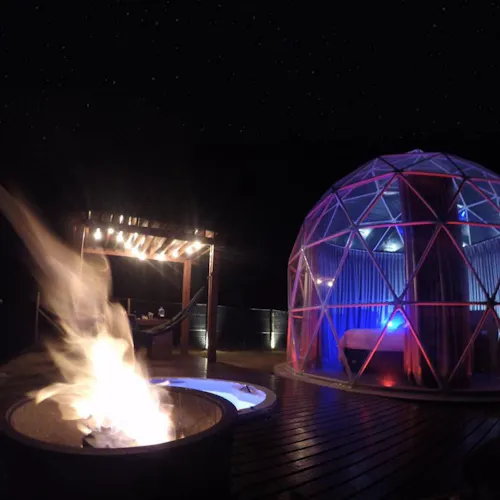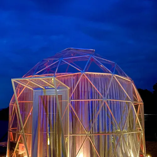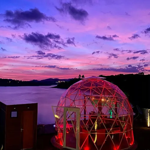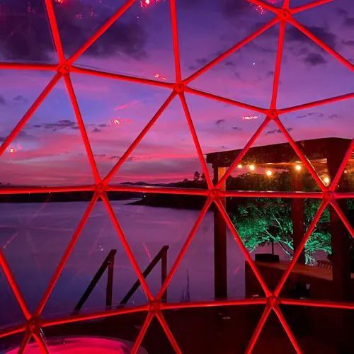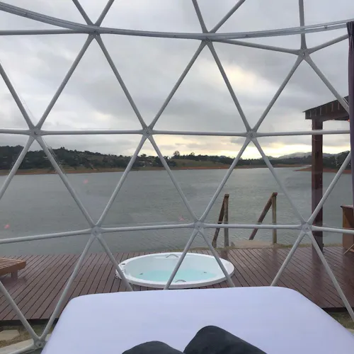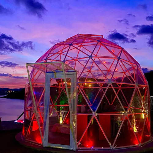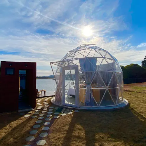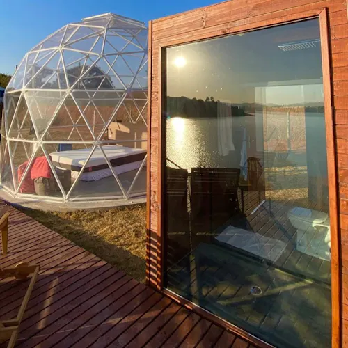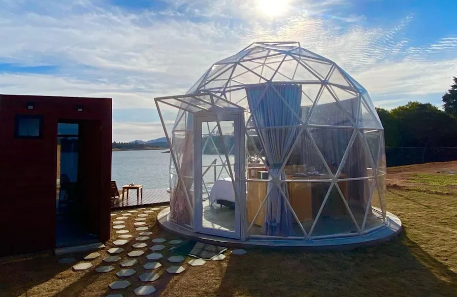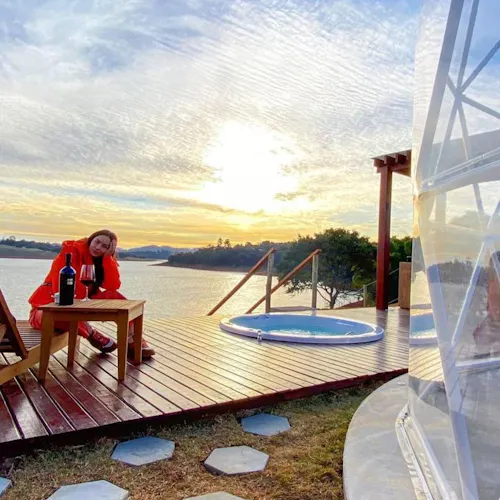 Bubble Experience é uma estrutura em forma de cúpula geodésica, totalmente transparente com vista para a represa, o céu e as estrelas.
