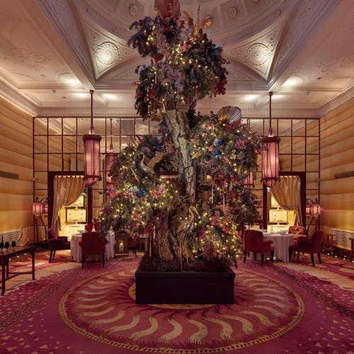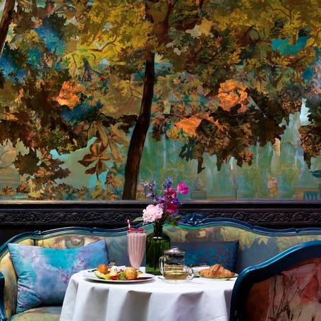 A criação de uma floresta encantada de decoupage inspirada no início da década de 1920 foi a ideia pensada para o ambiente Glade. Em 2017 o espaço foi incrementado com prateleiras de madeira esculpidas, estofados de veludo, tampos de mesa espelhados e teto de vidro colorido. O tapete é da artista têxtil argentina Alexandra Kehayoglou. Pra quem quer provar um café da manhã, almoçar ou tomar uns drinks no bar.