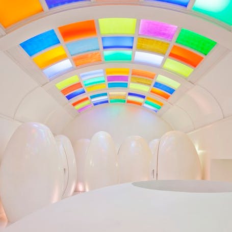 Esse é o famoso espaço todo rosa e é um dos ambientes mais fotografados do complexo. A cor aqui se tornou icônica. O artista responsável é o britânico David Shrigley, que trocou as antigas instalações artísticas preto e branco por várias coloridas!