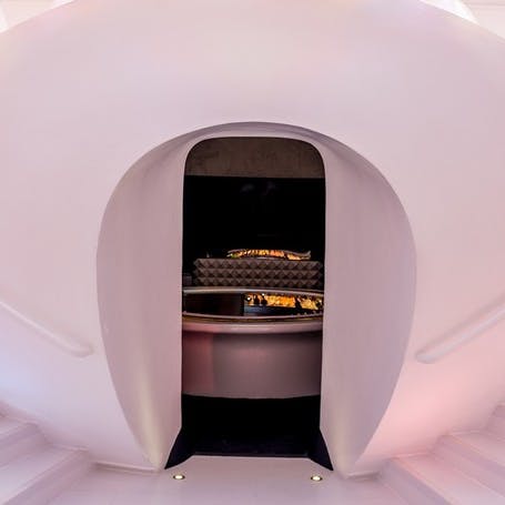 Um bar e lounge ultramoderno criado por Mourad Mazouz e o aclamado designer Noé Duchaufour-Lawrance, o ambiente é um espaço intimista e elegante para os clientes desfrutarem de um coquetel antes do jantar. Impossível não querer tirar uma foto nesse ambiente que tem também as conhecidas cabines de banheiro (logo acima do bar) que foram criadas por Duchaufour-Lawrance como uma experiência retro-futurista pra quem estiver por ali.