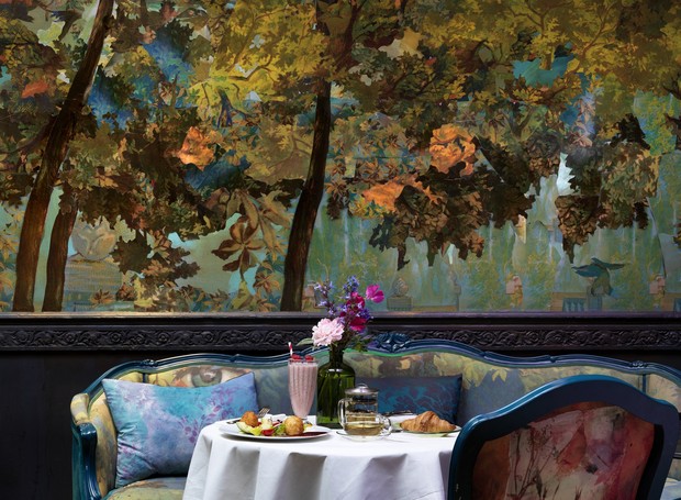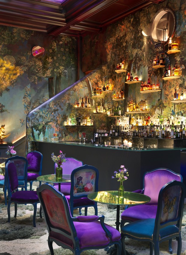A criação de uma floresta encantada de decoupage inspirada no início da década de 1920 foi a ideia pensada para o ambiente Glade. Em 2017 o espaço foi incrementado com prateleiras de madeira esculpidas, estofados de veludo, tampos de mesa espelhados e teto de vidro colorido. O tapete é da artista têxtil argentina Alexandra Kehayoglou. Pra quem quer provar um café da manhã, almoçar ou tomar uns drinks no bar.