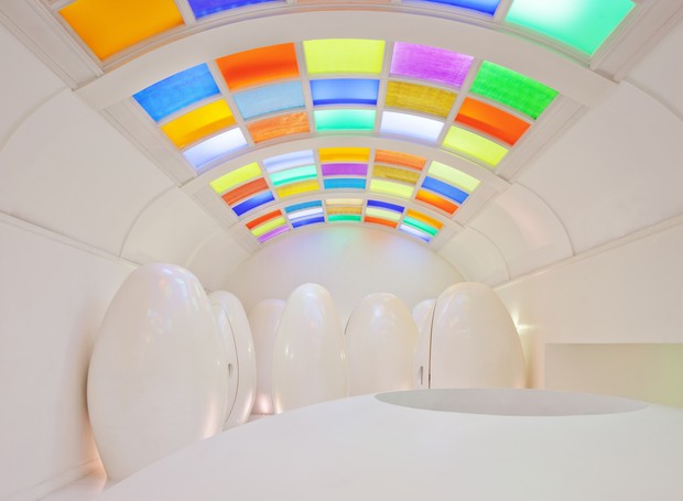 Esse é o famoso espaço todo rosa e é um dos ambientes mais fotografados do complexo. A cor aqui se tornou icônica. O artista responsável é o britânico David Shrigley, que trocou as antigas instalações artísticas preto e branco por várias coloridas!