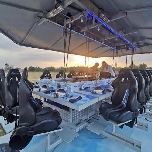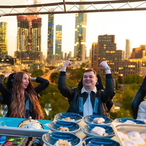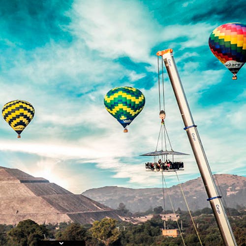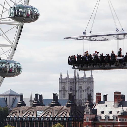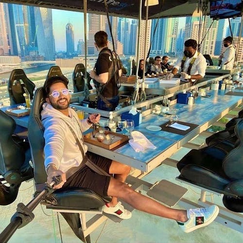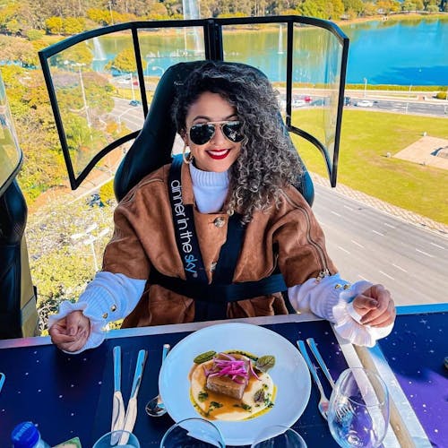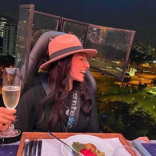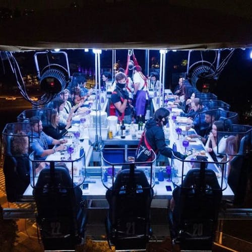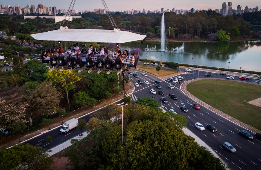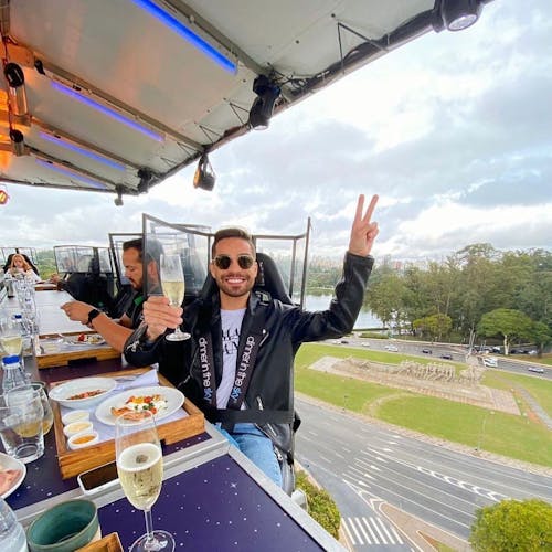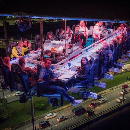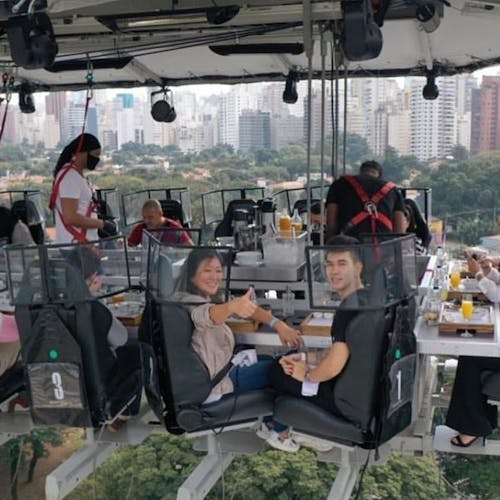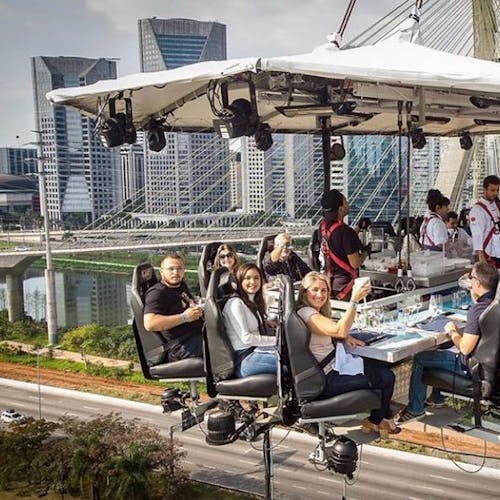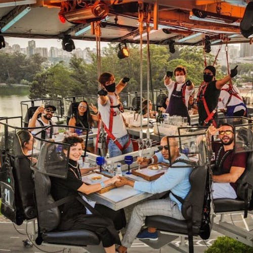 Uma plataforma a 50 metros de altura une 22 participantes que buscam sair da rotina com o melhor da gastronomia numa experiência bem diferente. As poltronas giram 180 graus e é possível ter uma vista 360 da experiência.