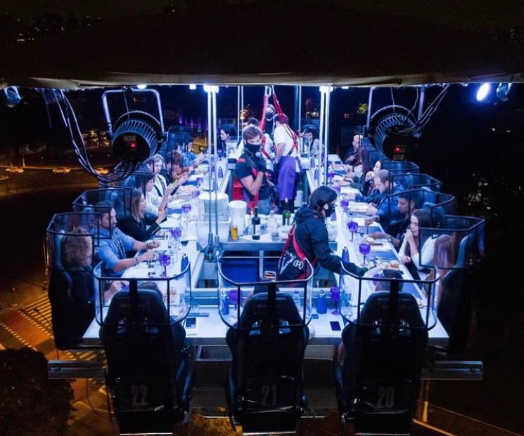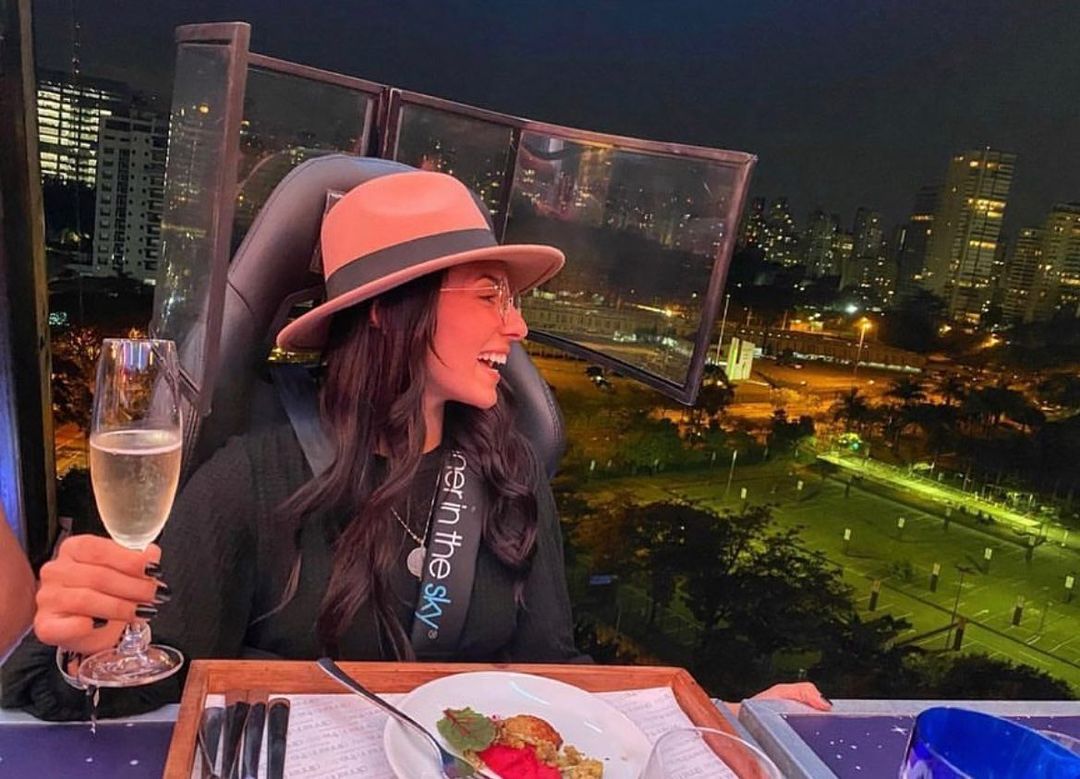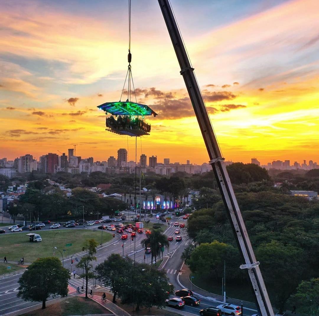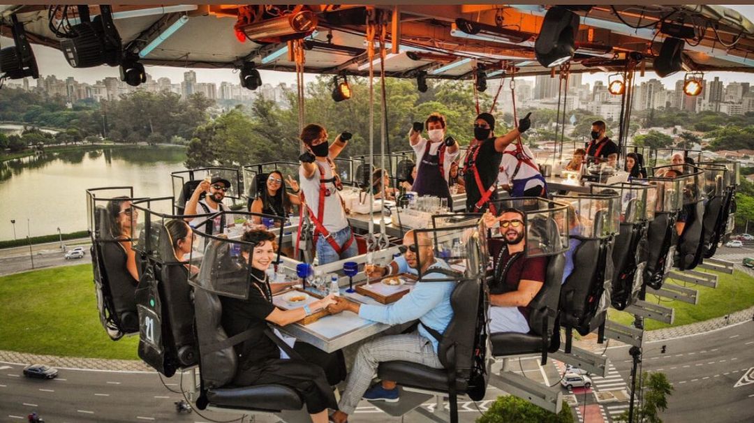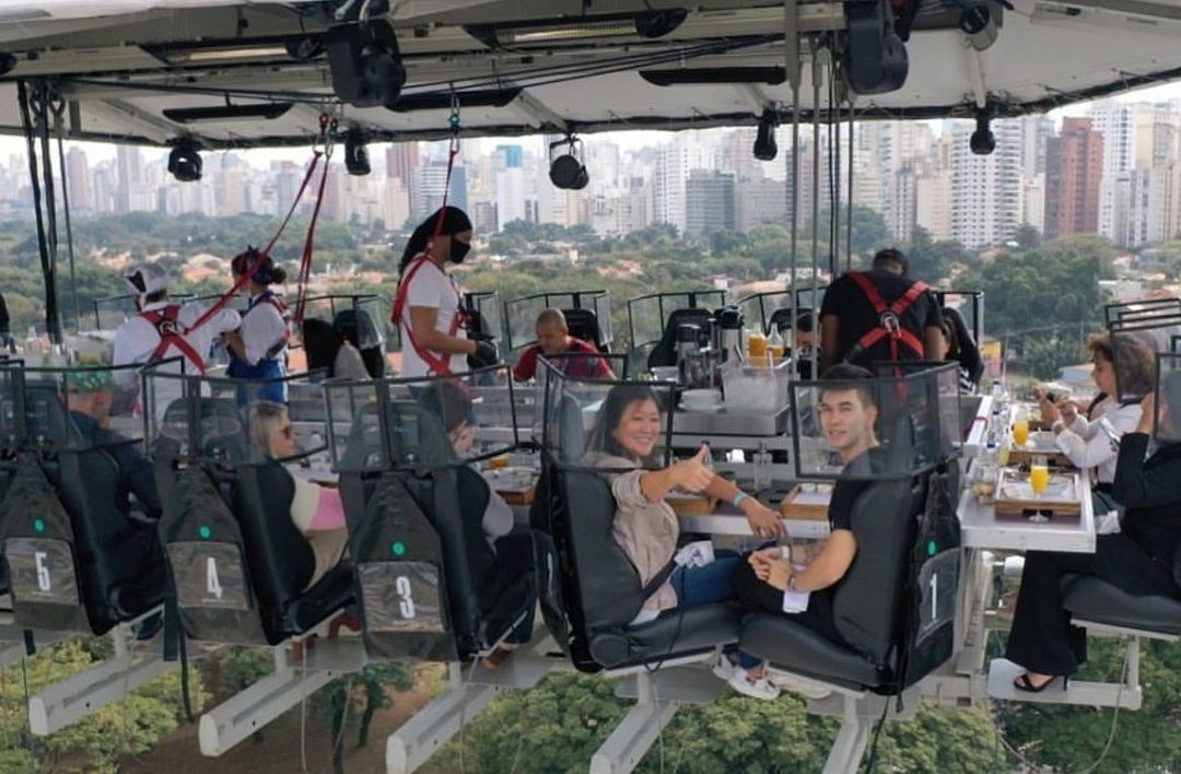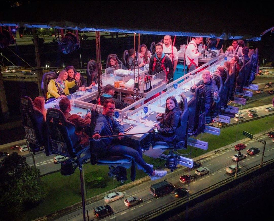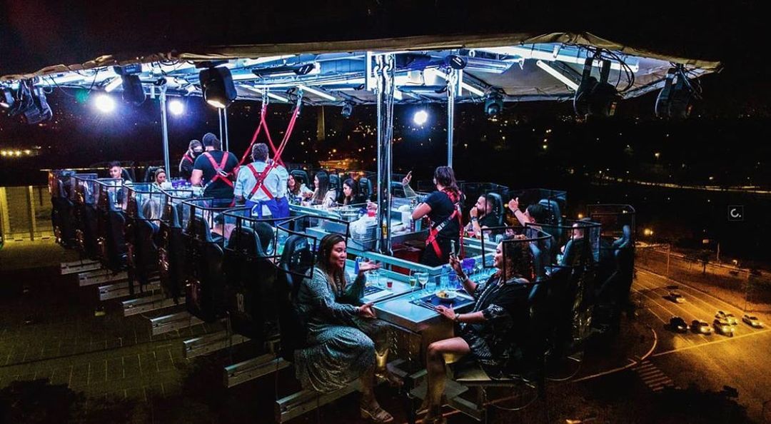 Uma plataforma a 50 metros de altura une 22 participantes que buscam sair da rotina com o melhor da gastronomia numa experiência bem diferente. As poltronas giram 180 graus e é possível ter uma vista 360 da experiência.