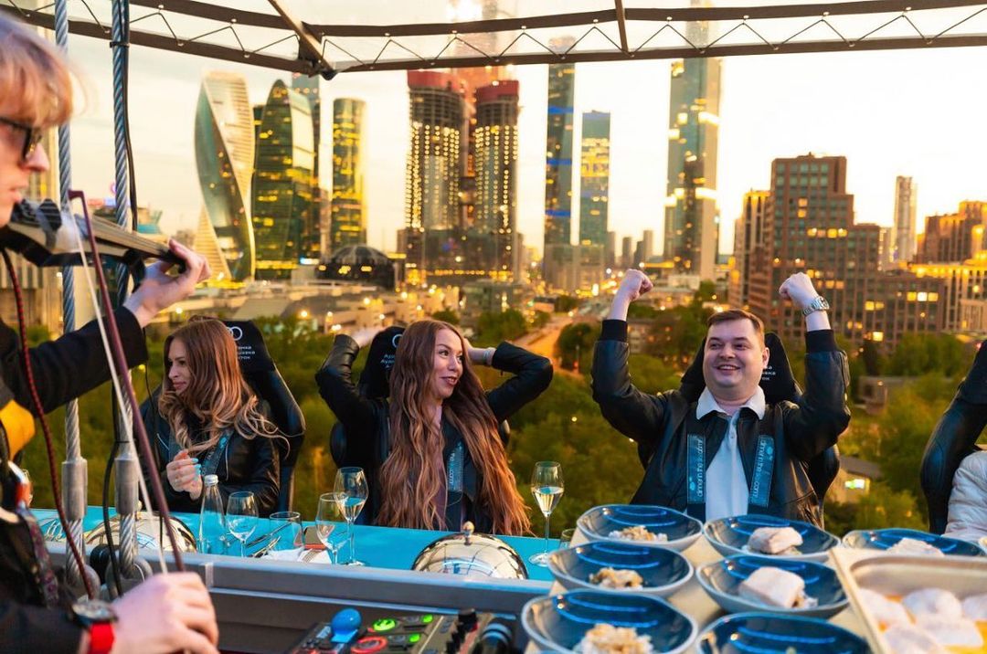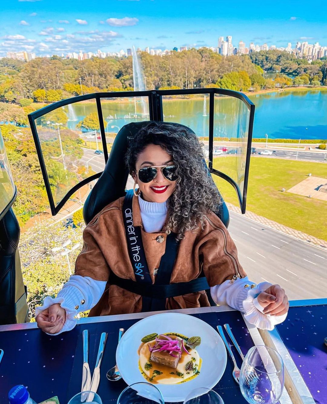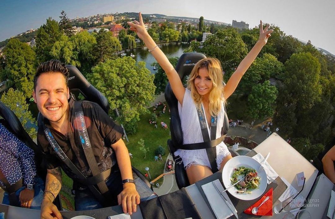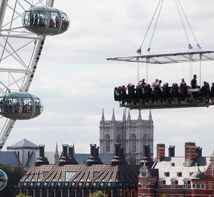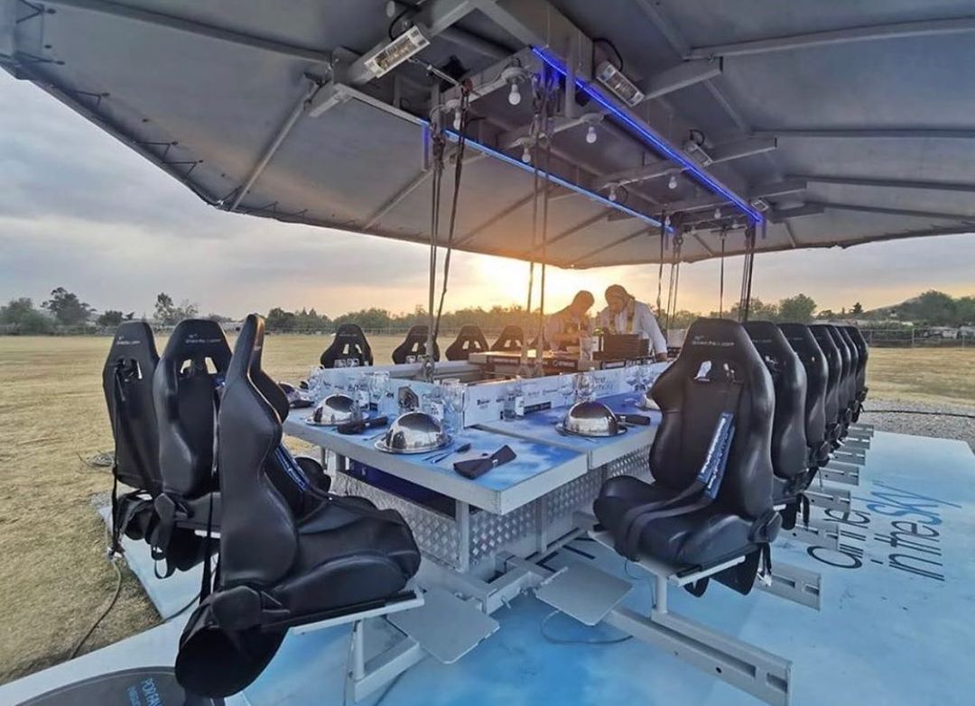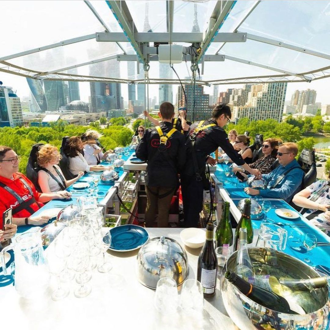 Uma plataforma a 50 metros de altura une 22 participantes que buscam sair da rotina com o melhor da gastronomia numa experiência bem diferente. As poltronas giram 180 graus e é possível ter uma vista 360 da experiência.
