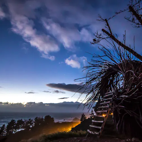 É necessário levar seus próprios sacos de dormir e outros equipamentos para a noite no alto do ninho. Este é um acampamento sem entrada como em hotel - você carrega seus próprios sacos de dormir e travesseiros durante a noite (se o tempo permitir) e arma sua barraca nas proximidades em caso de vento ou chuva! A hospedagem inclui o uso privado do ninho para duas pessoas e vem com um futon de tamanho normal dentro. Há uma mesa de piquenique e cozinha ao ar livre nas proximidades, com banheiros bem estruturados e acesso à água a poucos passos de distância. O Nest tem acesso por escada de madeira pela frente.