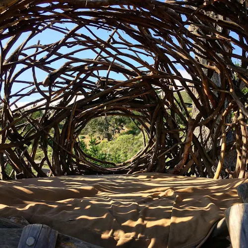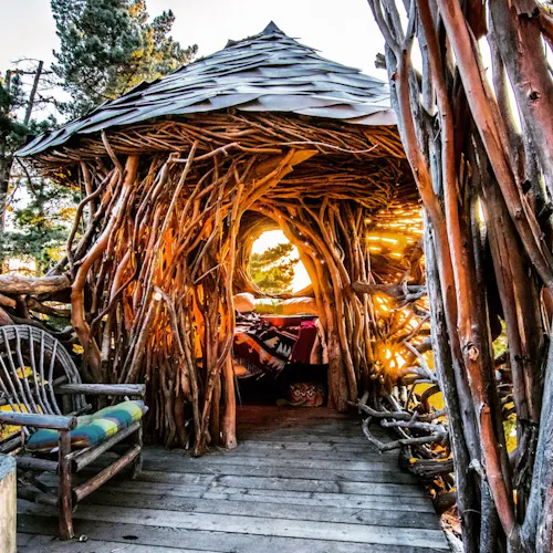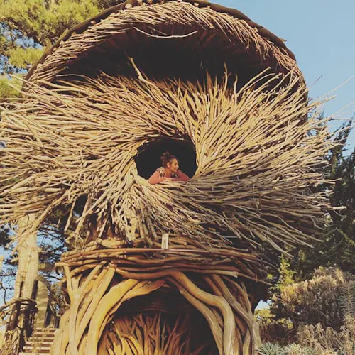 Chamado de HUMAN NEST, o ninho exclusivo oferece uma das melhores vistas do Treebones Resort, hotel que oferece a hospedagem. A ideia aqui é adormecer totalmente embalado em um ninho de tamanho humano, apenas com um fino colchão forrando o chão, sem portas ou cortinas e com seu entorno exatamente como em um ninho real: há espaços entreabertos na madeira, ou seja, choveu molhou! Esta arte em madeira incomum foi criada e construída pelo artista de Big Sur, Jayson Fann.