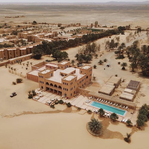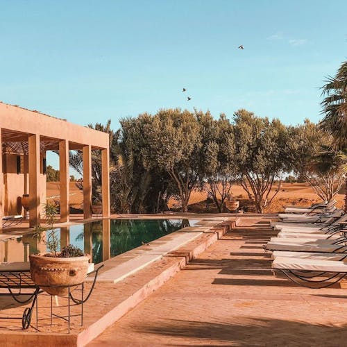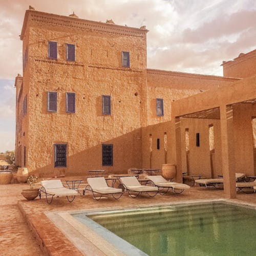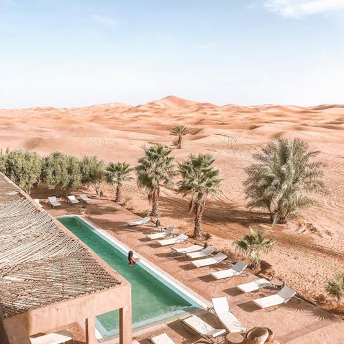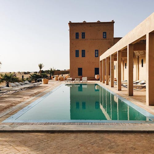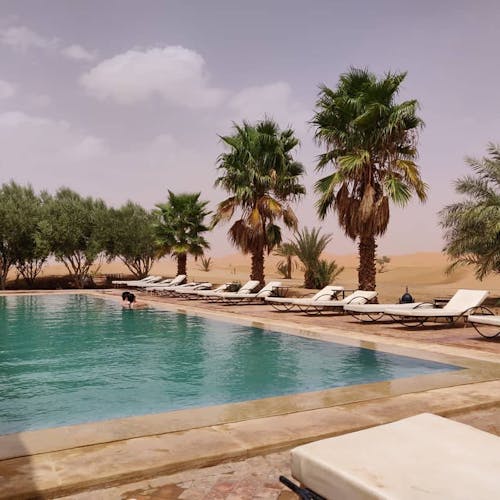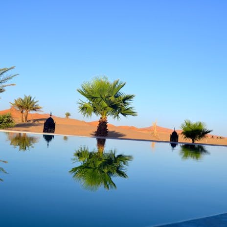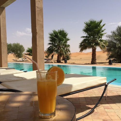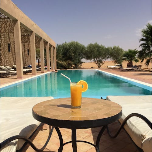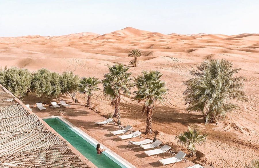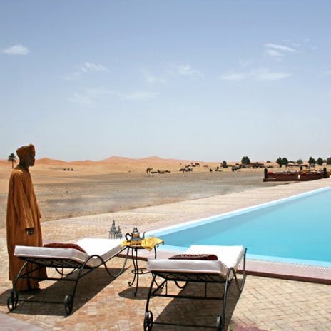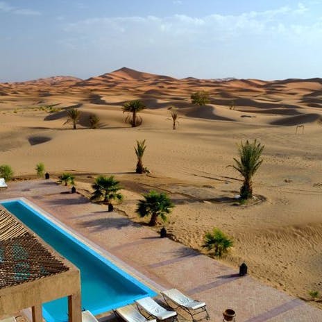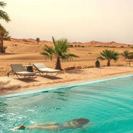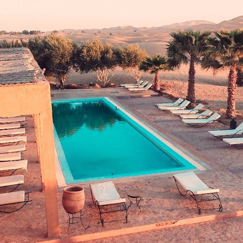 Em um ambiente de paz e autenticidade, observar a espetacular areia dourada das dunas do Deserto do Saara enquanto curte seu banho de piscina, não é nada mal. Abastecida com água do próprio poço do hotel, seu layout cria a sensação única de tomar banho no meio do deserto. É uma ótima opção pra relaxar!