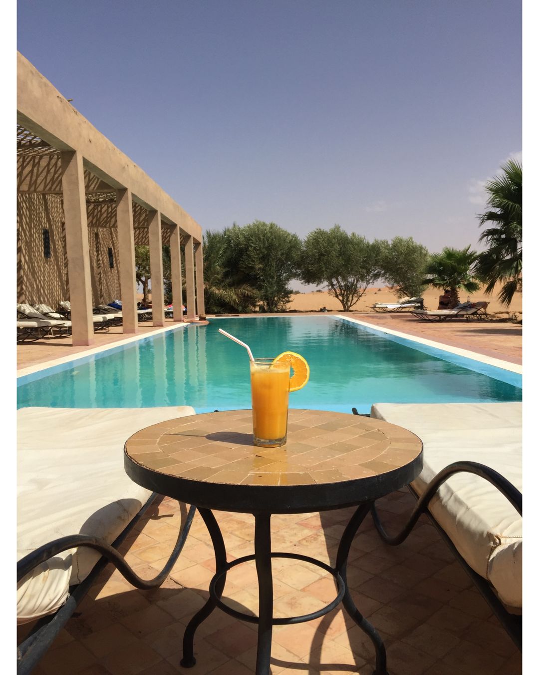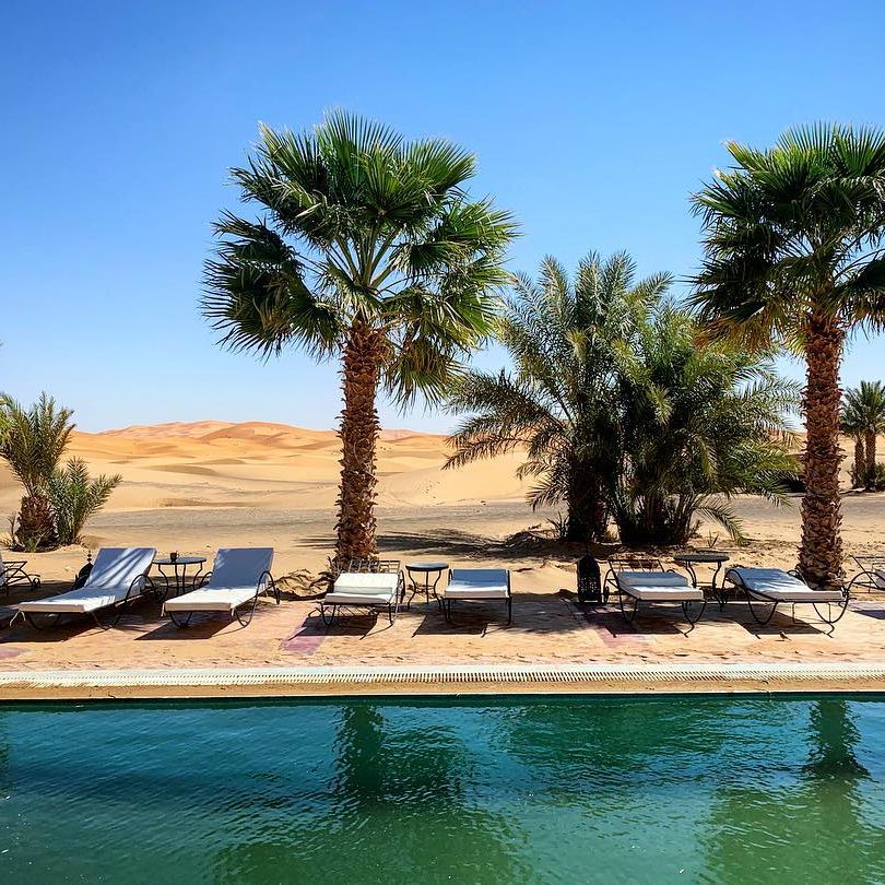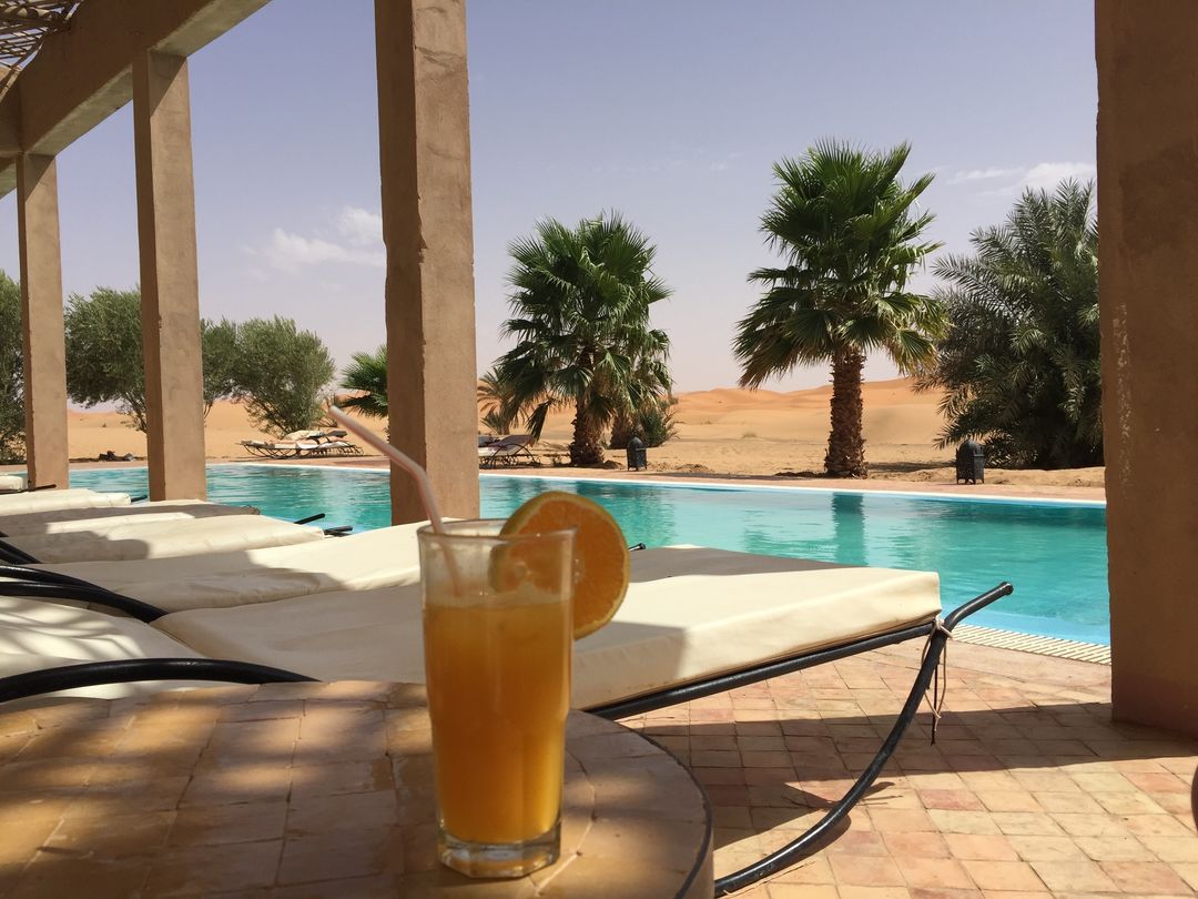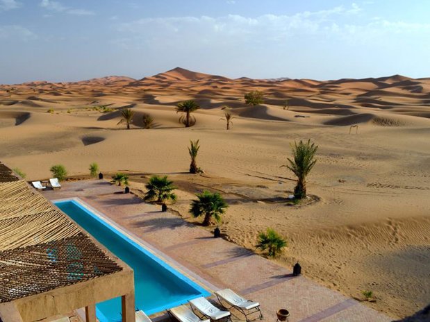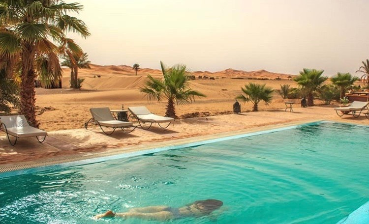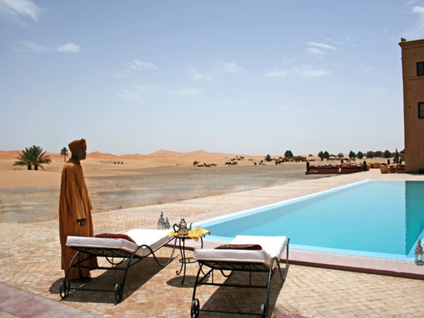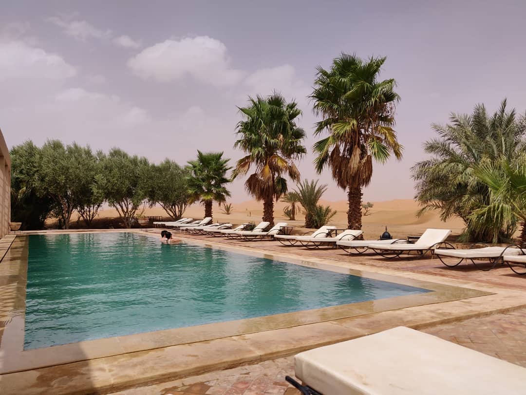 Em um ambiente de paz e autenticidade, observar a espetacular areia dourada das dunas do Deserto do Saara enquanto curte seu banho de piscina, não é nada mal. Abastecida com água do próprio poço do hotel, seu layout cria a sensação única de tomar banho no meio do deserto. É uma ótima opção pra relaxar!
