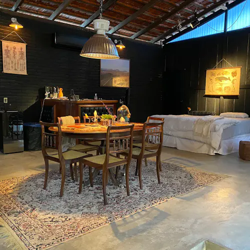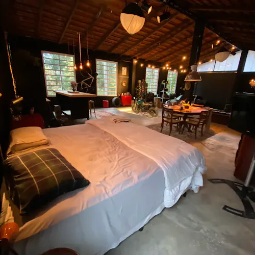 A casa galpão fica disponível para locação pelo Airbnb e o link está logo abaixo das fotos.
