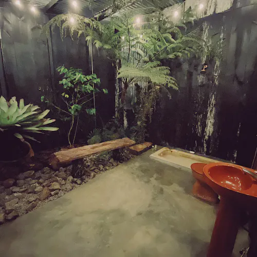 Ao lado de fora da casa há uma área com parilla, e o banheiro além de muito estiloso completa os ambientes exóticos da casa, é bem aberto e com iluminação natural.