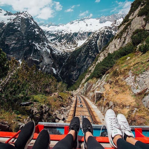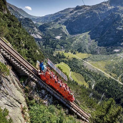 Com uma inclinação de até 106%, este funicular como é conhecido ou pra nós praticamente quase uma montanha russa, é o mais inclinado do seu tipo na Europa. Originalmente construído para transportar materiais de construção pesados para a barragem do lago Gelmer (LINDÍSSIMO), hoje está aberto pra quem está em busca de aventura podendo transportar até 24 pessoas simultaneamente. O funicular chega ao vale Gelmer em 1.860 metros acima do nível do mar. Uma vez no topo, uma caminhada ao redor do lago turquesa é obrigatória, ou uma caminhada até a cabana Gelmer para visitar alguns mirantes espetaculares.