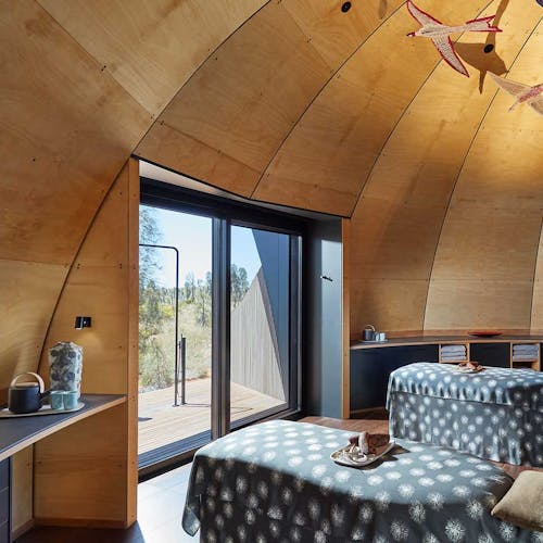 Com vista direta para Uluru (ou Ayers Rock - o segundo maior monólito do mundo, é o cenário onde as dunas são vermelho-ferrugem bem no centro da Austrália). O Longitude 131 é o acampamento de luxo mais famoso da Austrália. São apenas 15 cabanas, cada uma oferecendo conexão com a paisagem: as cabanas tem a frente de vidro e ficam ao redor de uma bela fogueira. Pra completar a experiência, um SPA completo espera os hóspedes para tratamentos de relaxamento e bem-estar.