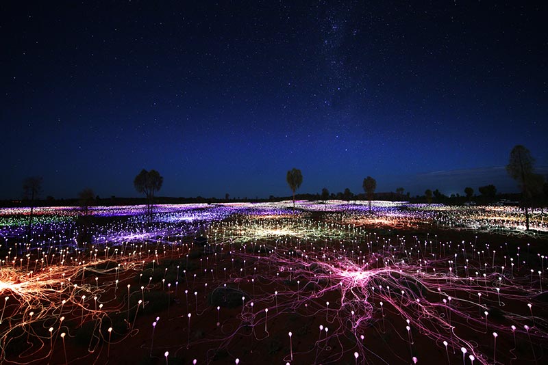 - Field of Light: A instalação Field of Light do artista Bruce Munro tem 50.000 caules em forma de botão que florescem e parecem balançar enquanto a escuridão desce sobre o deserto da Austrália, causando um efeito luminoso surreal. Também incluso na hospedagem.