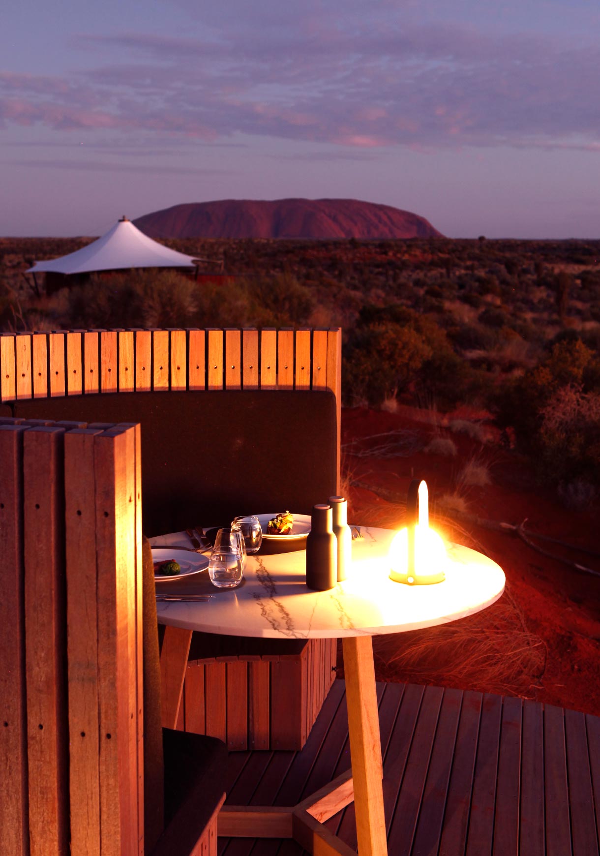 Uma estadia no Longitude 131 é experimentar o luxo em uma viagem. Cada tenda está localizada em um ponto do deserto com cenário natural extraordinário, uma experiência pessoal de cultura e história locais, arte e gastronomia local com vinhos provenientes de produtores regionais.