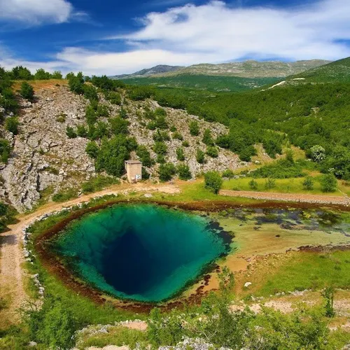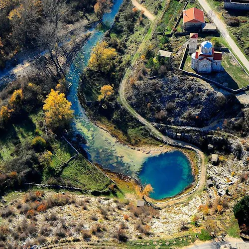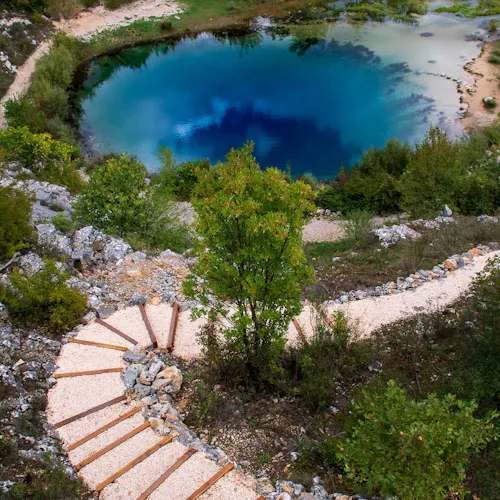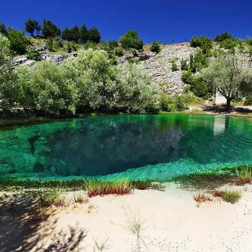 Perto de uma pequena vila está um reservatório de visual magnífico em tons de azul e verde, que é a origem do rio Cetina, a Glavas Cave é uma caverna imersa no Cetina Lake, que é a maior nascente do rio na Croácia: tem mais de 130 metros de profundidade.