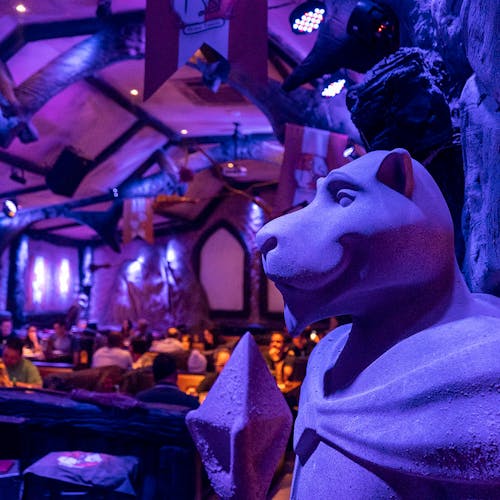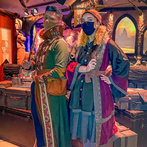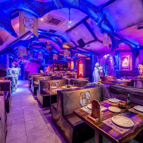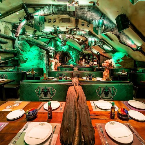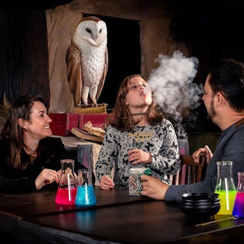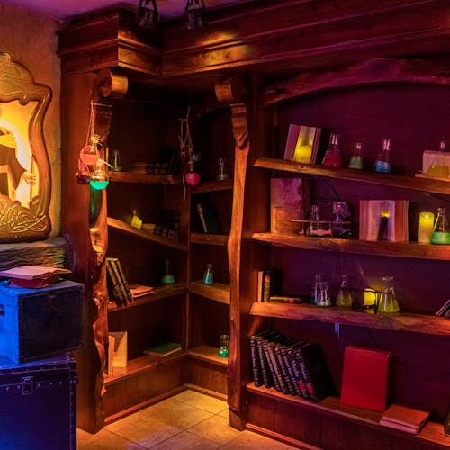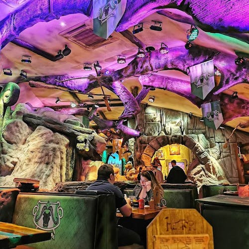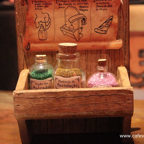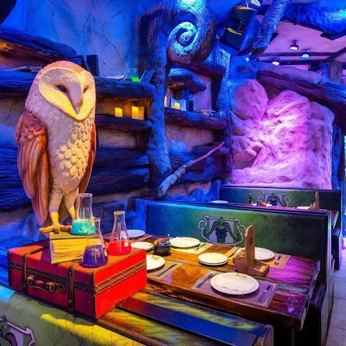 O ambiente todo é decorado com livros de feitiços, varinhas e vassouras, o local é dividido por ambientes entre o primeiro e segundo andar. Há ainda fumaças e luzes coloridas que mudam conforme a música que está tocando pra tornar o clima ainda mais especial.