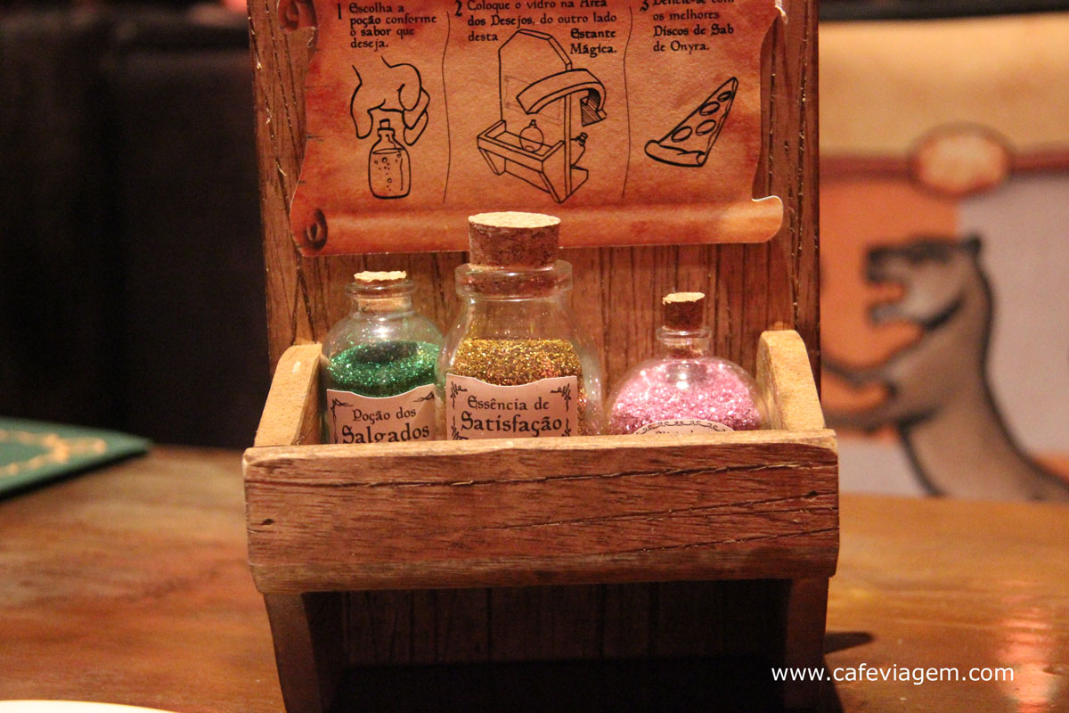 A casa funciona por sistema de rodízio e as pizzas são chamadas de discos de sabor. Elas são servidas por aprendizes da escola e duendes caracterizados e engraçados que interagem com todos no local. Para sinalizar na mesa se deseja ou não mais pizza, e quais você quer, há potinhos de poções coloridos onde um é para pizzas doces, outro salgadas e o outro é pra dizer que não quer ser servido, basta usá-los ao lado do prato.