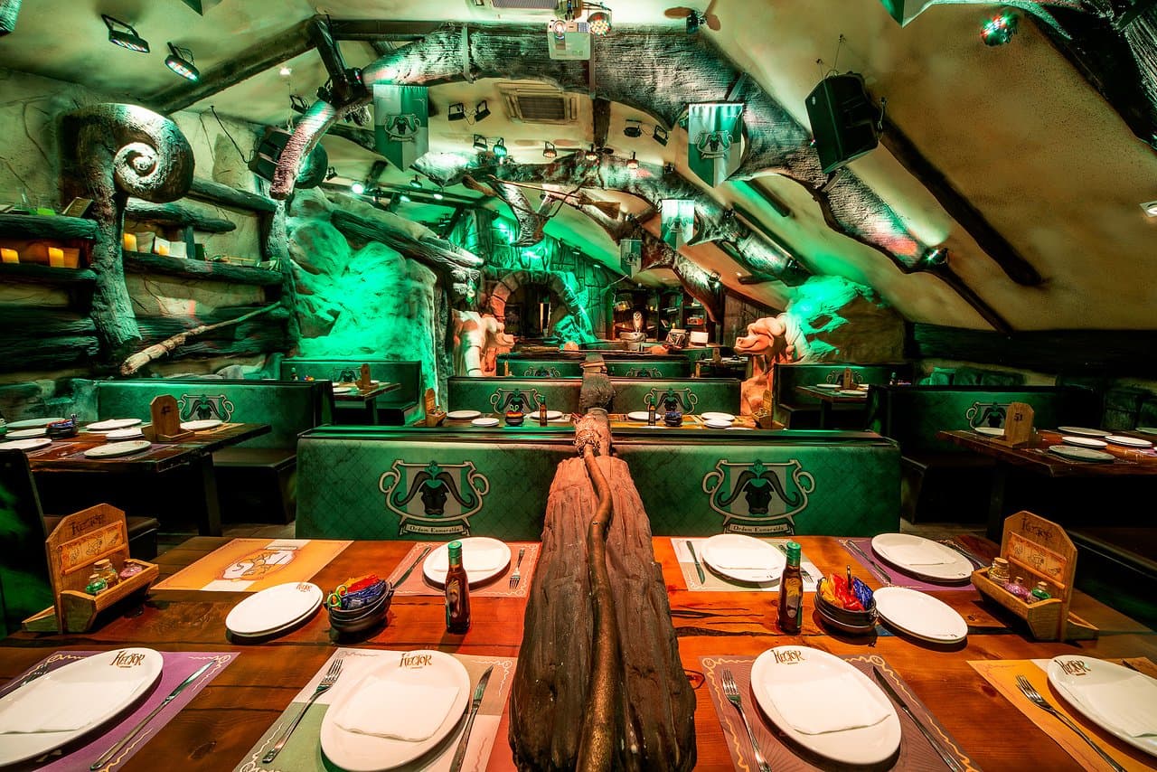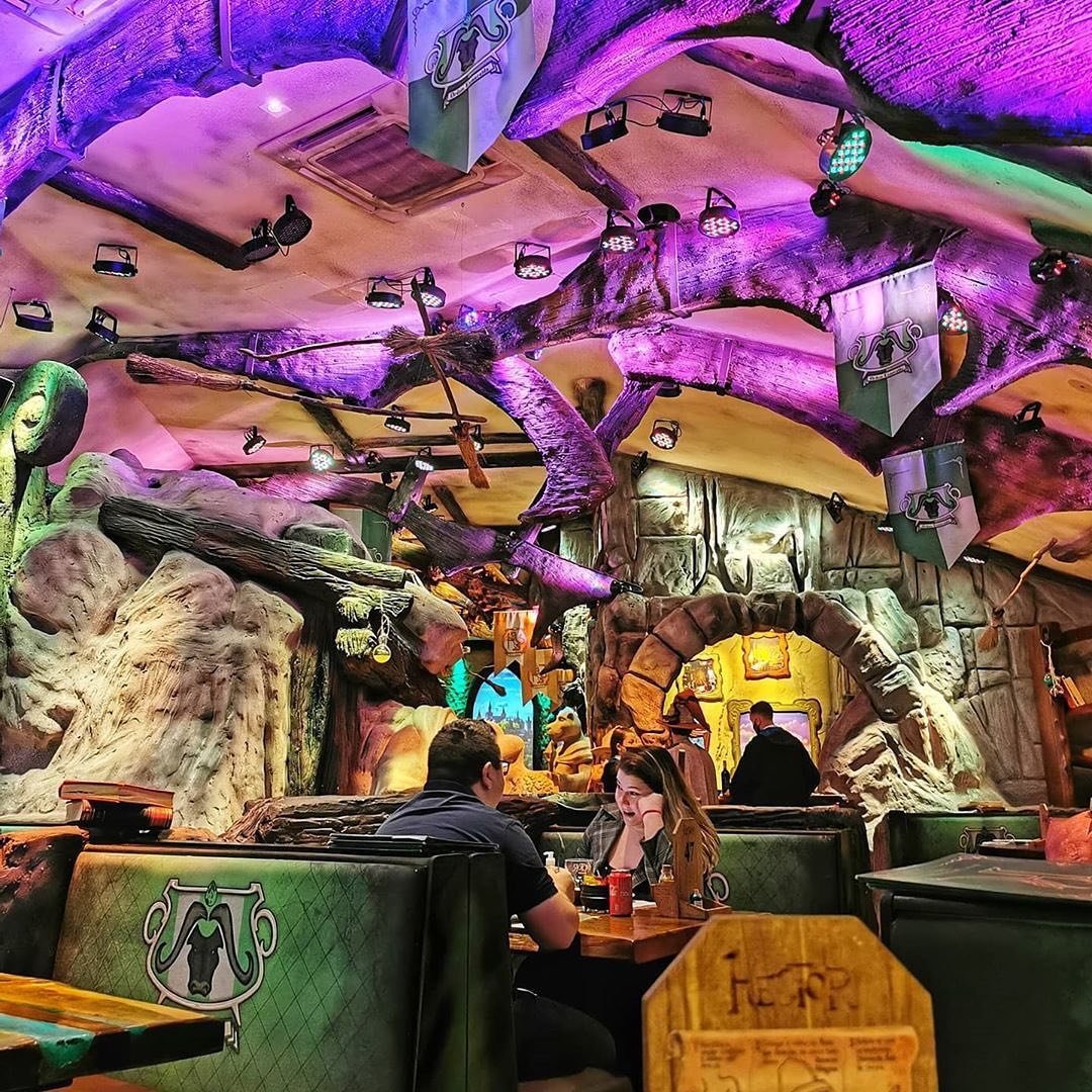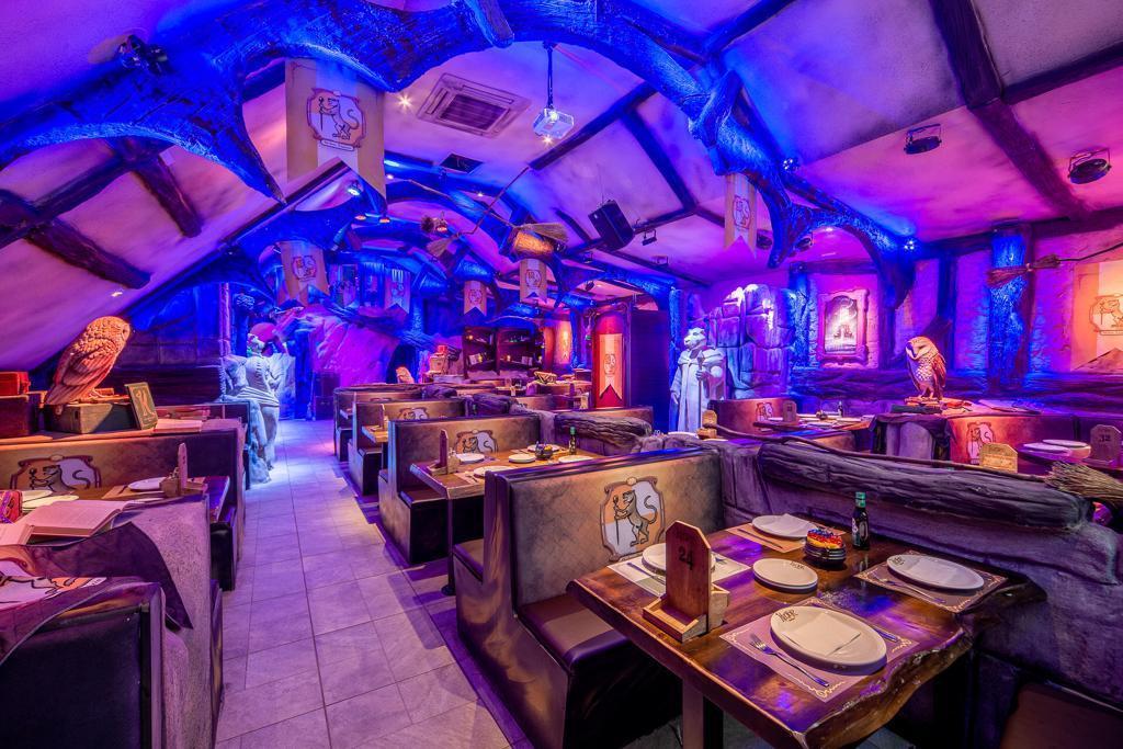 O ambiente todo é decorado com livros de feitiços, varinhas e vassouras, o local é dividido por ambientes entre o primeiro e segundo andar. Há ainda fumaças e luzes coloridas que mudam conforme a música que está tocando pra tornar o clima ainda mais especial.