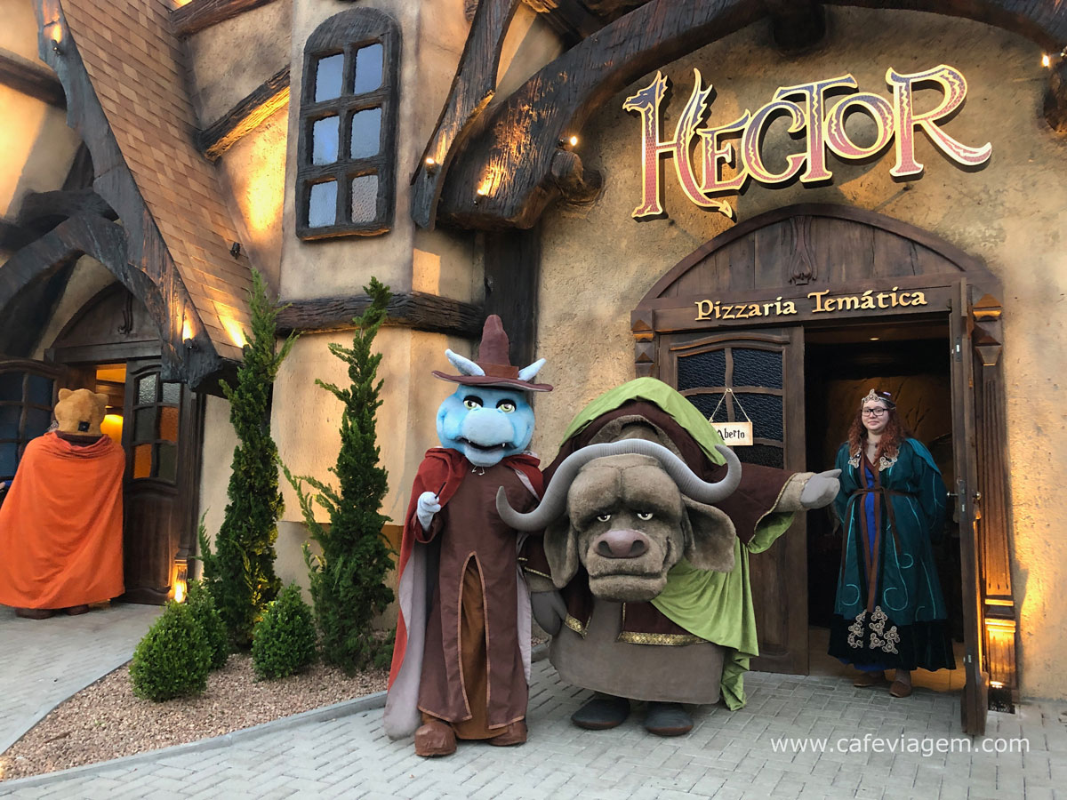 Já na chegada, tudo funciona como uma atração de parque mesmo. Em uma pequena sala, funcionários carismáticos usam uniformes especiais e há personagens temáticos que transitam por todo o ambiente interagindo com os visitantes, nesse momento são apresentados os personagens da Pizzaria Hector. É impossível não lembrar de Harry Potter! Apesar da coruja presente no local, da escola de magia e de muitas outras referências ao bruxo famoso – na pizzaria temática de Gramado o astro é o dragão Hector e seus amigos. Eles fazem parte da escola de magia. Após esse primeiro contato na chegada, os visitantes escutam sobre a história de Hector - um dragão que perdeu o poder de cuspir fogo e agora conta com a ajuda de amigos para fazer poções.