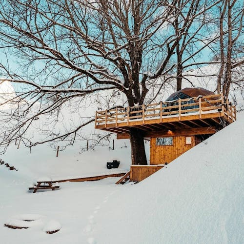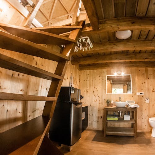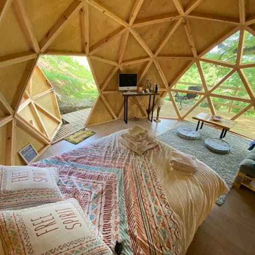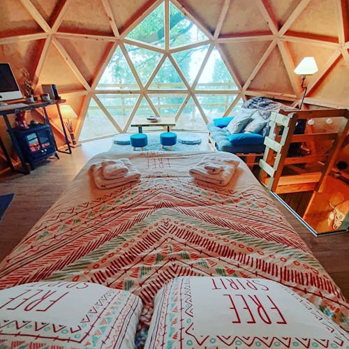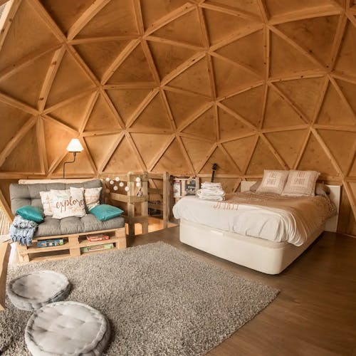 O espaço é perfeito para viagens rápidas e românticas. O quarto possui uma área de estar com aquecimento. O jardim sob a cúpula é muito isolado e oferece churrasqueira a gás, mesa de piquenique e jacuzzi. Com muito silêncio, no local se escuta apenas os cantos de pássaros e os sinos das vacas.