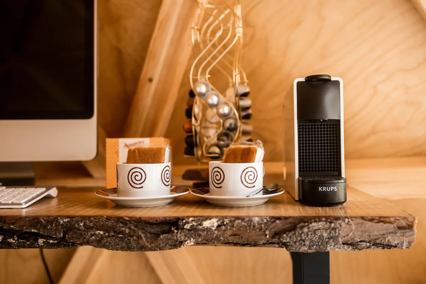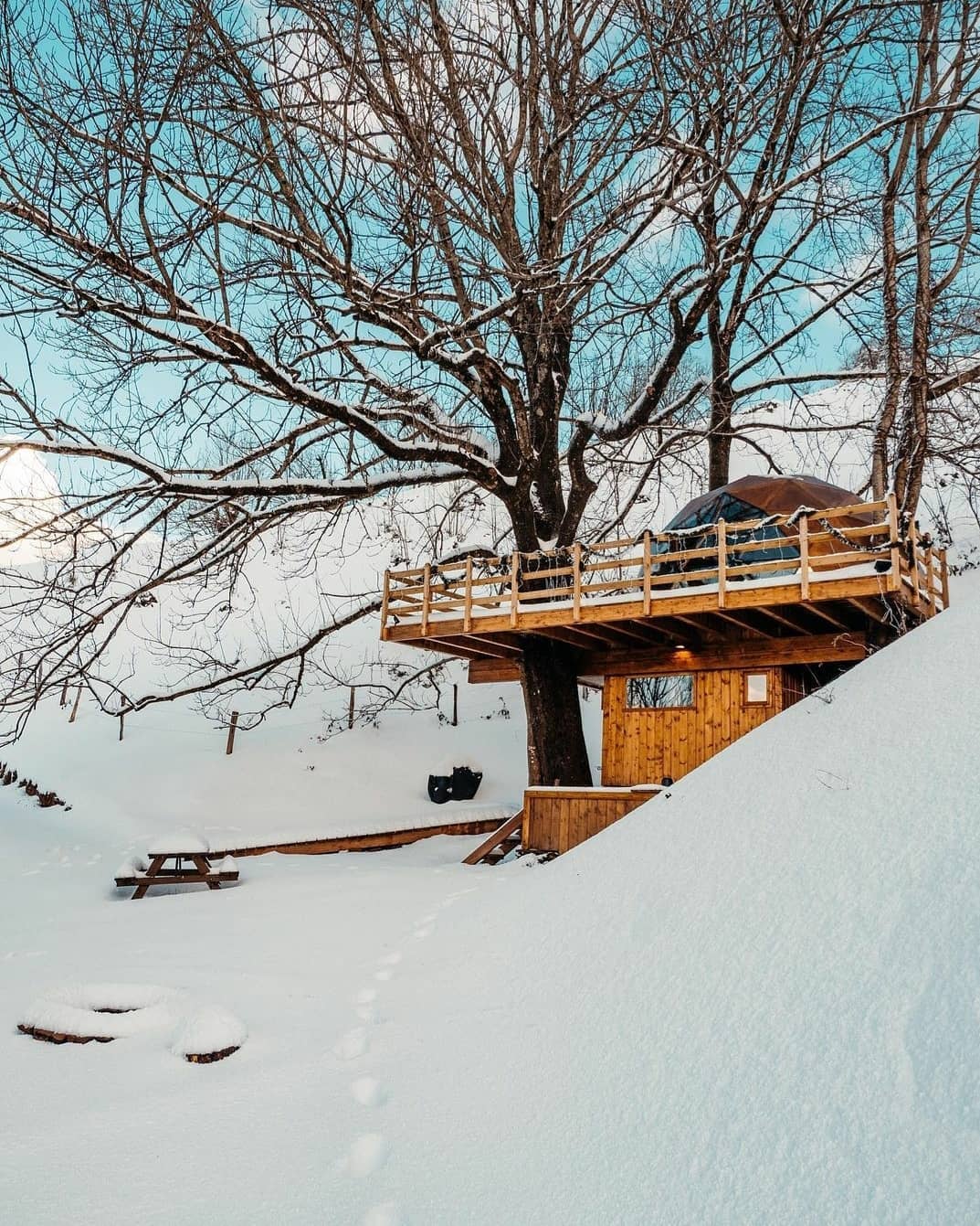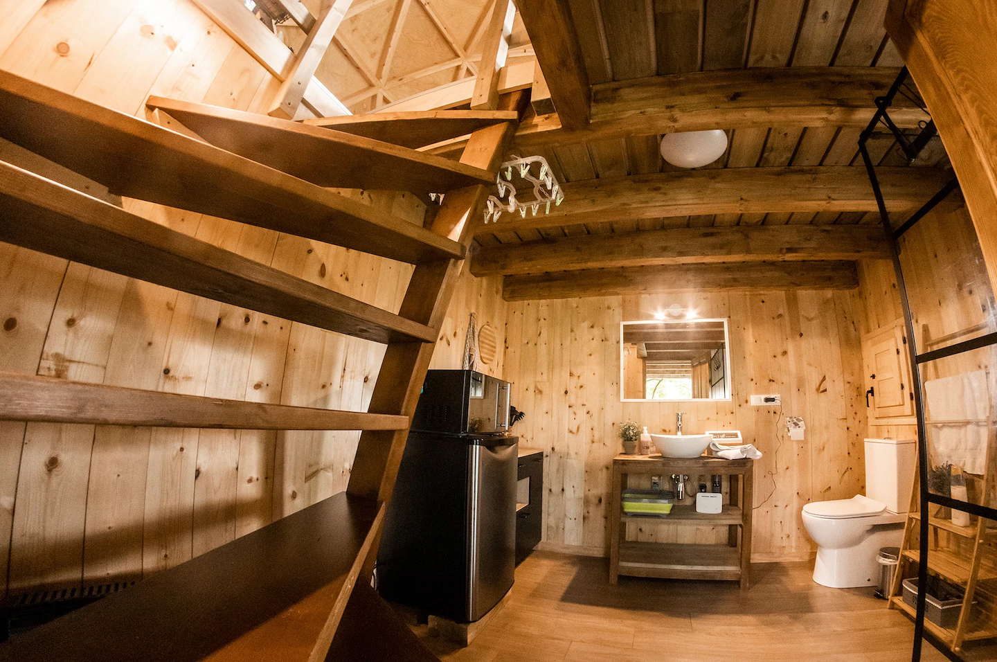 O espaço é perfeito para viagens rápidas e românticas. O quarto possui uma área de estar com aquecimento. O jardim sob a cúpula é muito isolado e oferece churrasqueira a gás, mesa de piquenique e jacuzzi. Com muito silêncio, no local se escuta apenas os cantos de pássaros e os sinos das vacas.