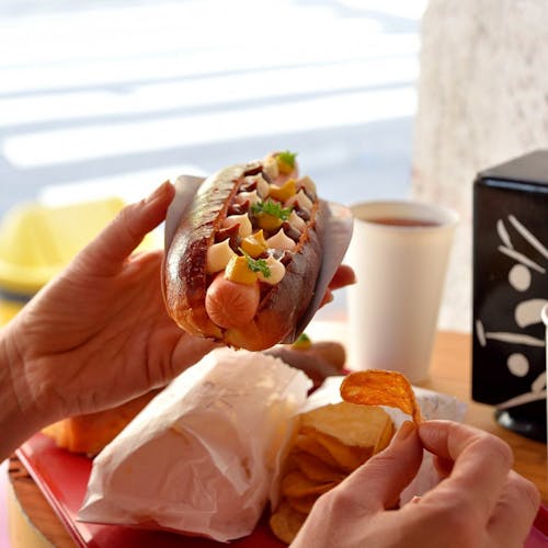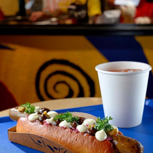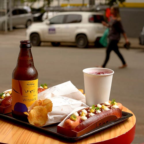 Já a versão veggie é igualzinha ao Hot Pork, porém a salsicha suína é substituída pela artesanal vegetariana feita de cogumelos e tofu. Para acompanhar seu Hot é possível escolher entre os snacks de porporoca, batata chips ou nuggets de frango.