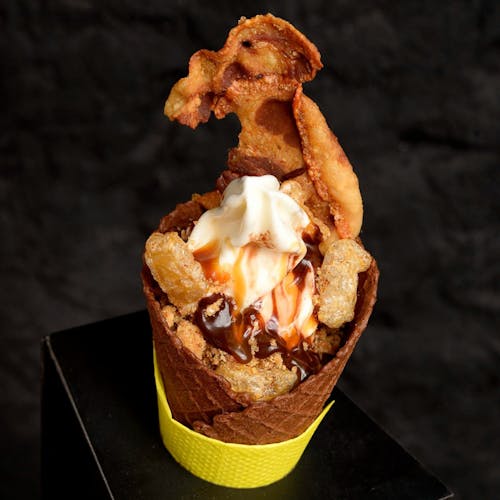 - BACON com SORVETE? Ousado! Acredite: é um dos favoritos. Só provando pra saber. Leite + bacon + chocolate + caramelo + porporoca