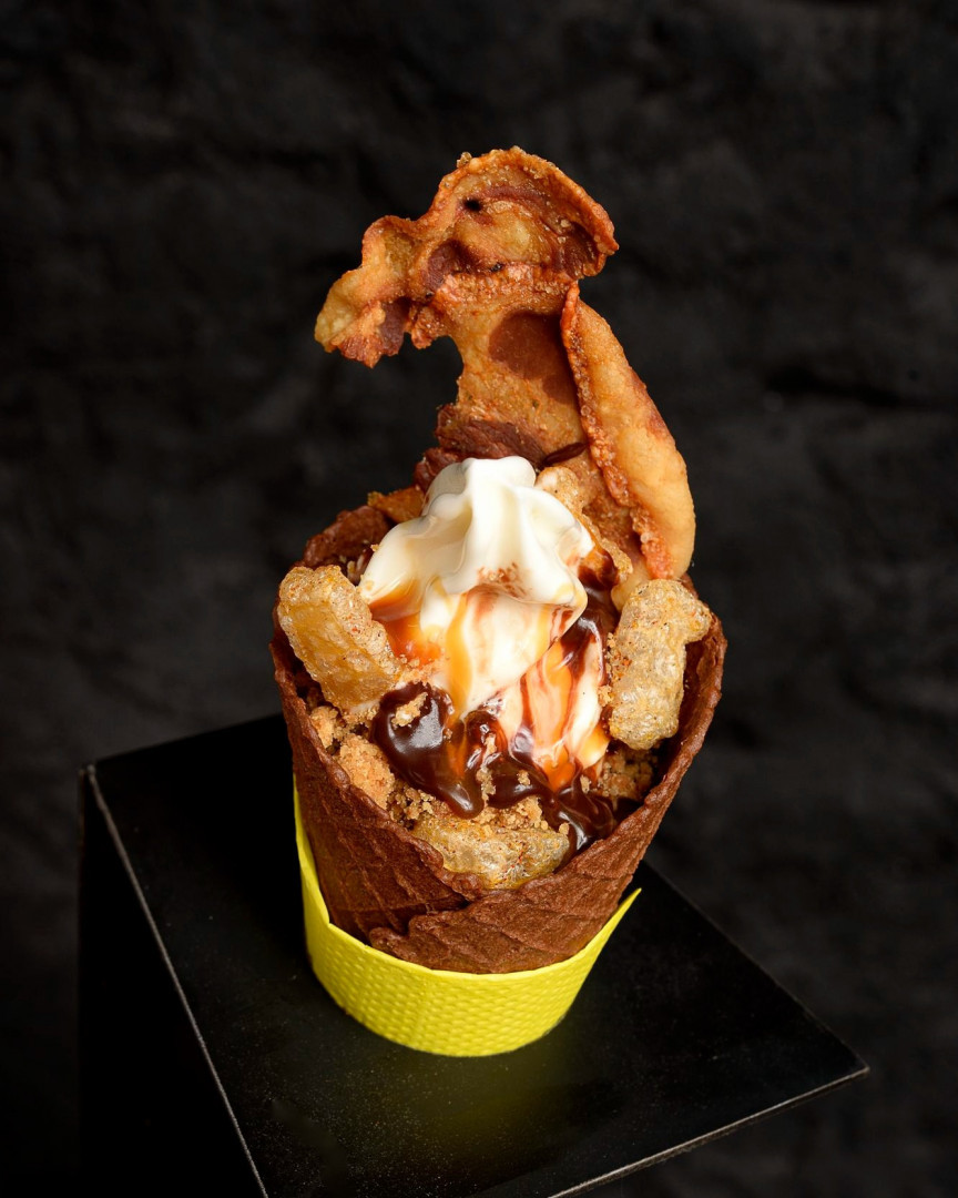 - BACON com SORVETE? Ousado! Acredite: é um dos favoritos. Só provando pra saber. Leite + bacon + chocolate + caramelo + porporoca