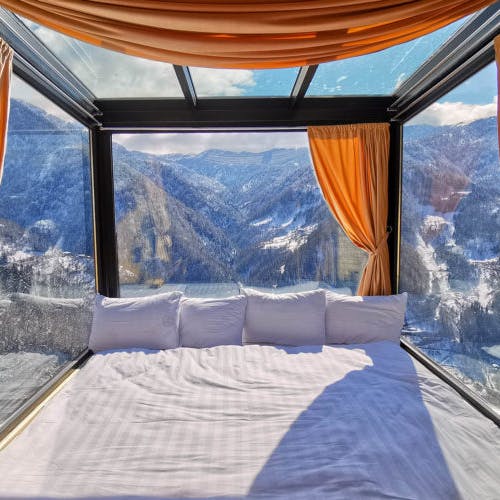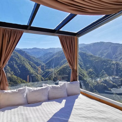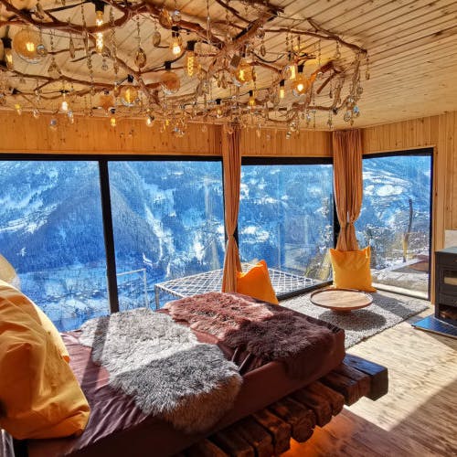 O descolado hotel que oferece cabanas criativas com quartos de vidro suspensos no alto da montanha