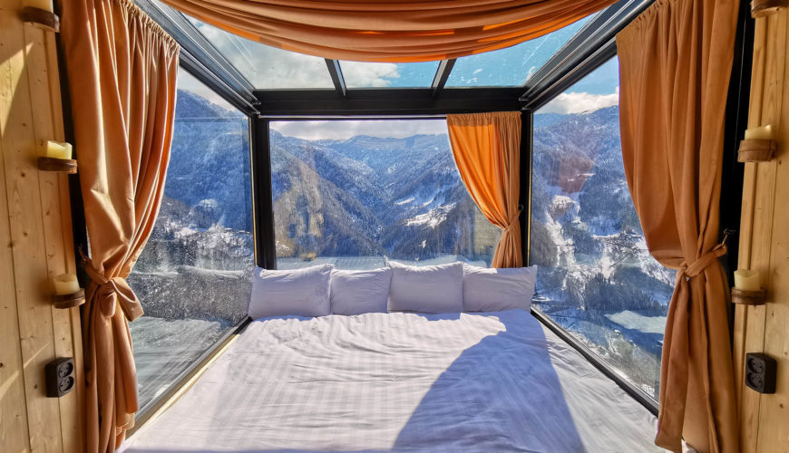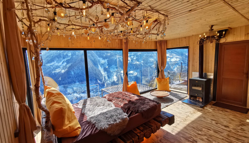 O descolado hotel que oferece cabanas criativas com quartos de vidro suspensos no alto da montanha