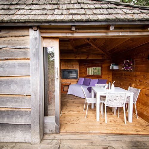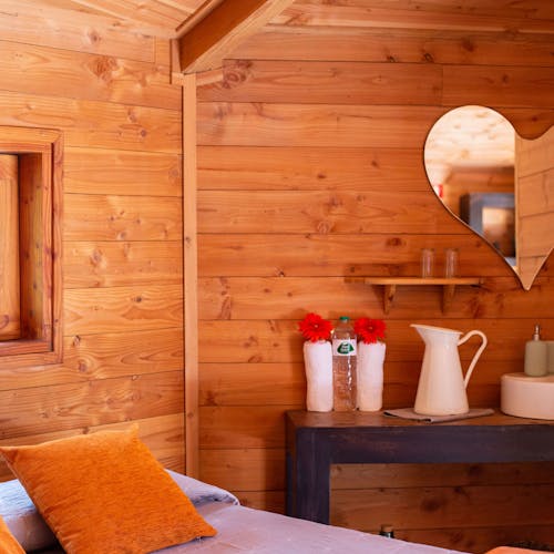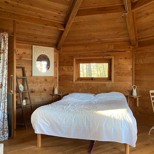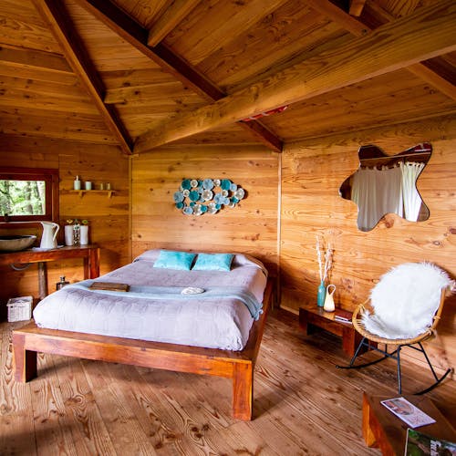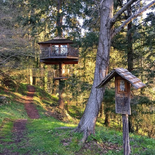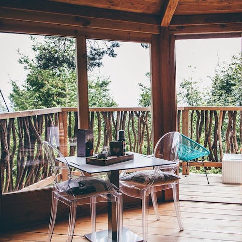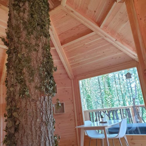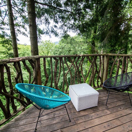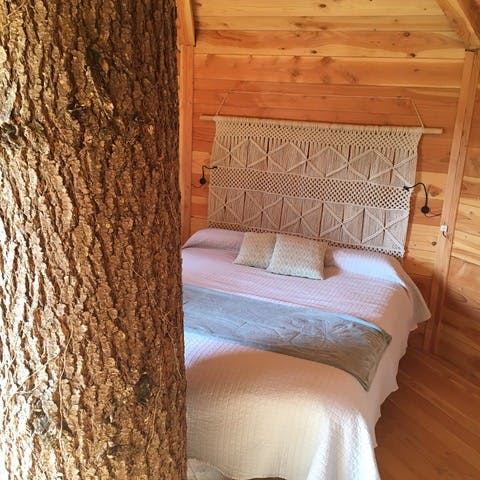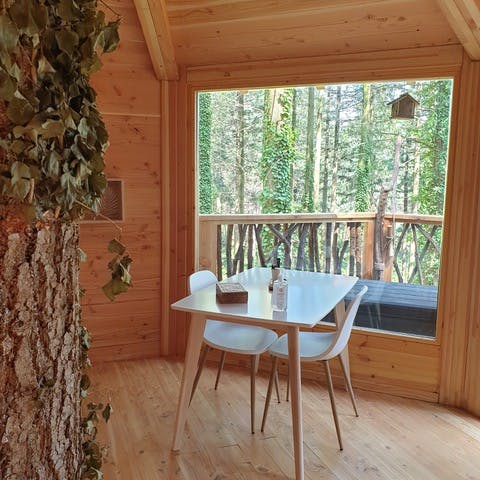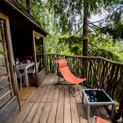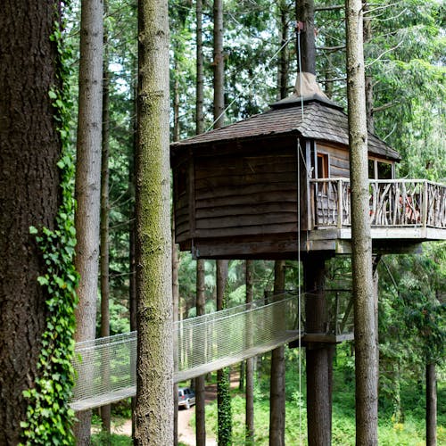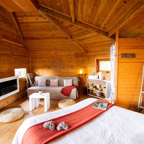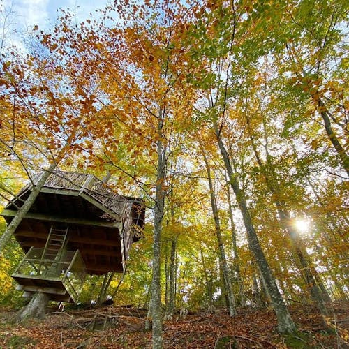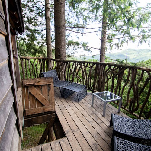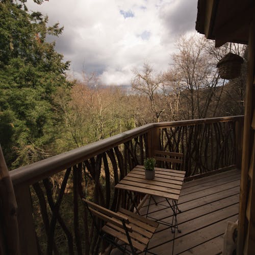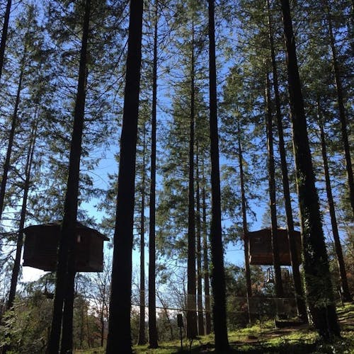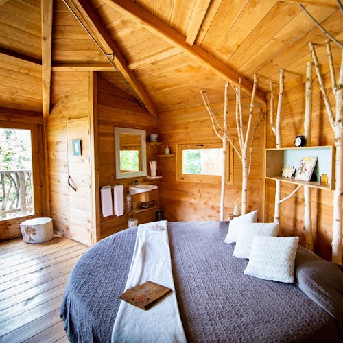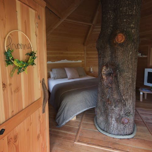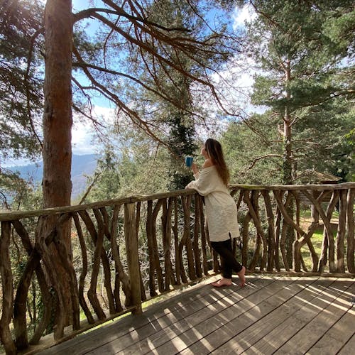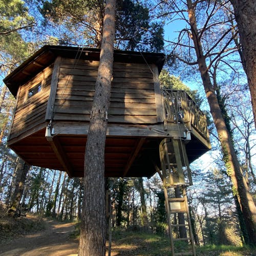 As cabanas ficam imersas na incrível floresta de Sant Hilari Sacalm. São 16 tipos de casas, que acomodam de 2 a 4 hóspedes e ficam de 3 a 15 metros de altura do chão! Adaptadas ao tamanho da árvore que as sustenta, as cabines têm formato octogonal e área média de 30 m2. Os terraços tem 10 m2 e oferece um espaço de descanso e relaxamento, para aproveitar ao máximo o ambiente da floresta com uma vista espetacular. É possível acessar a casa por meio de uma ponte ou escada vertical.