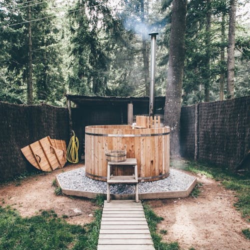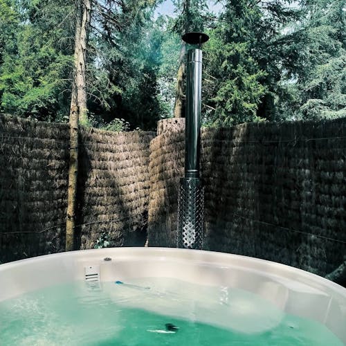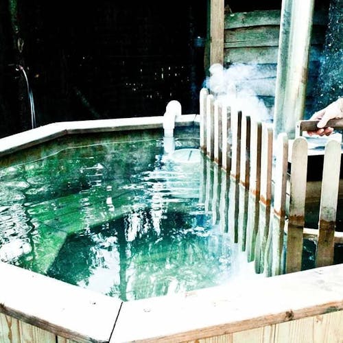 SPA ecológico: O spa e piscina, também ficam no meio da mata, em harmonia com o meio ambiente. É composto por jacuzzis, imersão e sauna finlandesa, ambos aquecidos apenas a lenha. A água vem do poço.