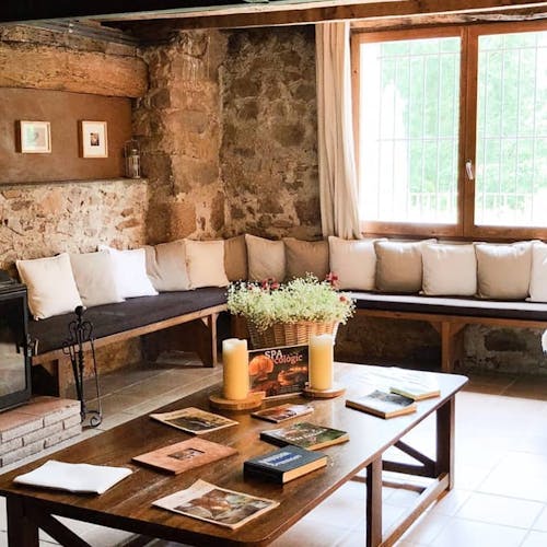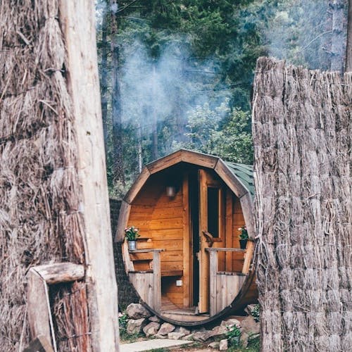 Ao chegar, os hóspedes estacionam entre as árvores próximo à casa da fazenda (apoio central), que possui mais de sete séculos de história. Após receberem as informações na recepção, seguem para sua acomodação, caminhando pela mata e guiados por placas. Cada cabana tem sua própria vista e decoração. Todas com pia, um banheiro ecológico seco e uma lareira montada na parede para jantares e noites de inverno. O café da manhã é servido em uma cesta pendurada em uma roldana.