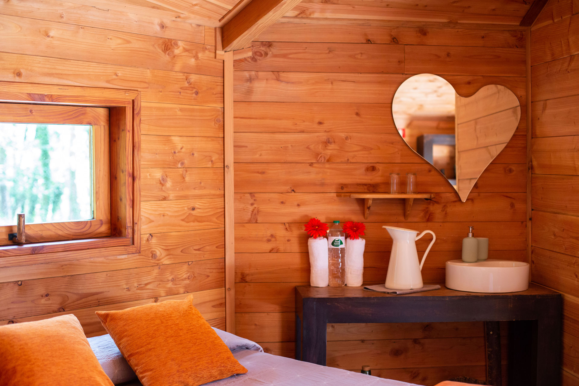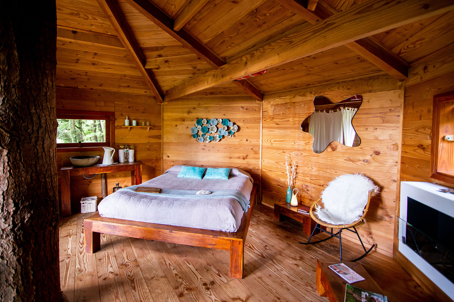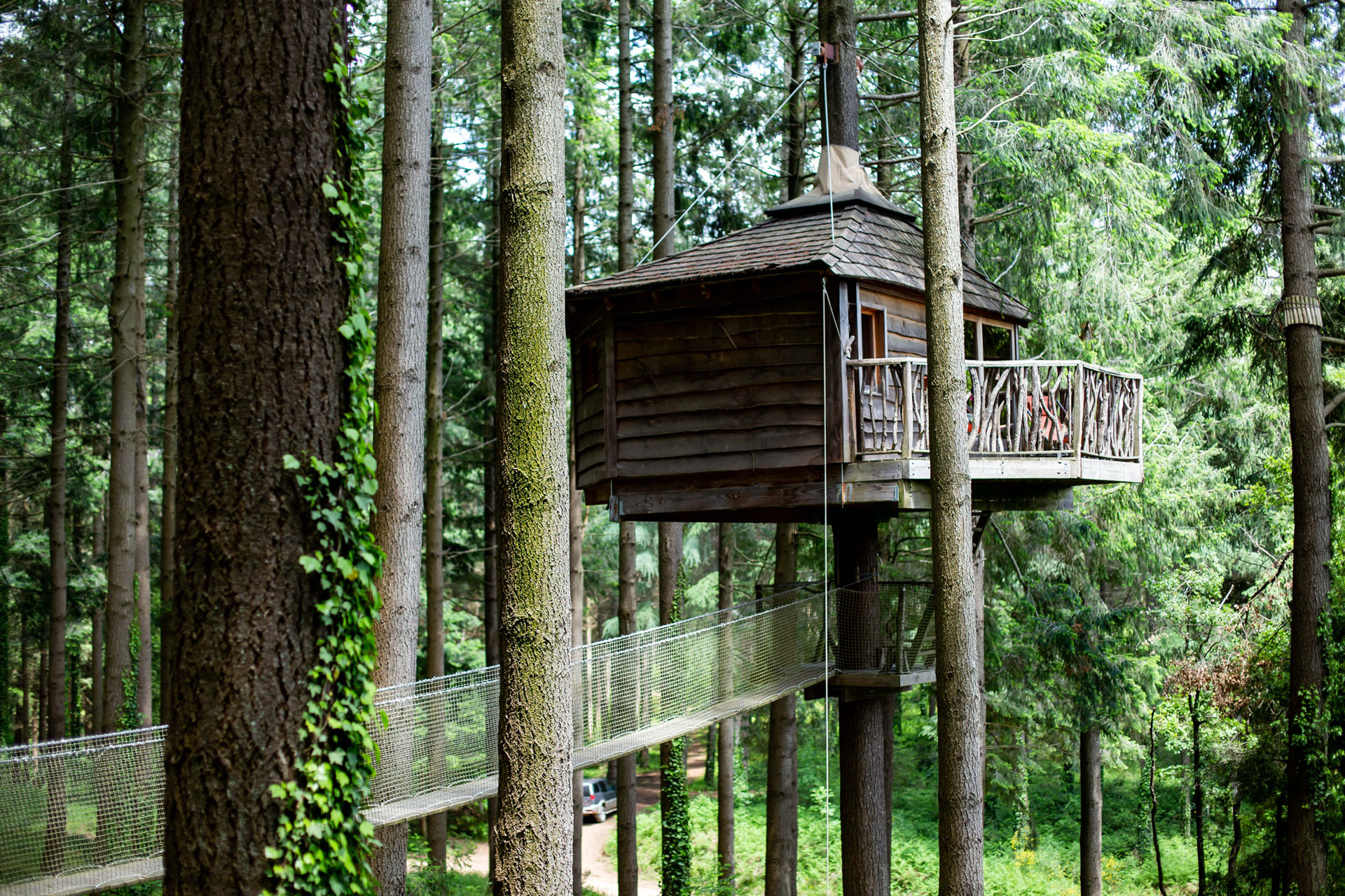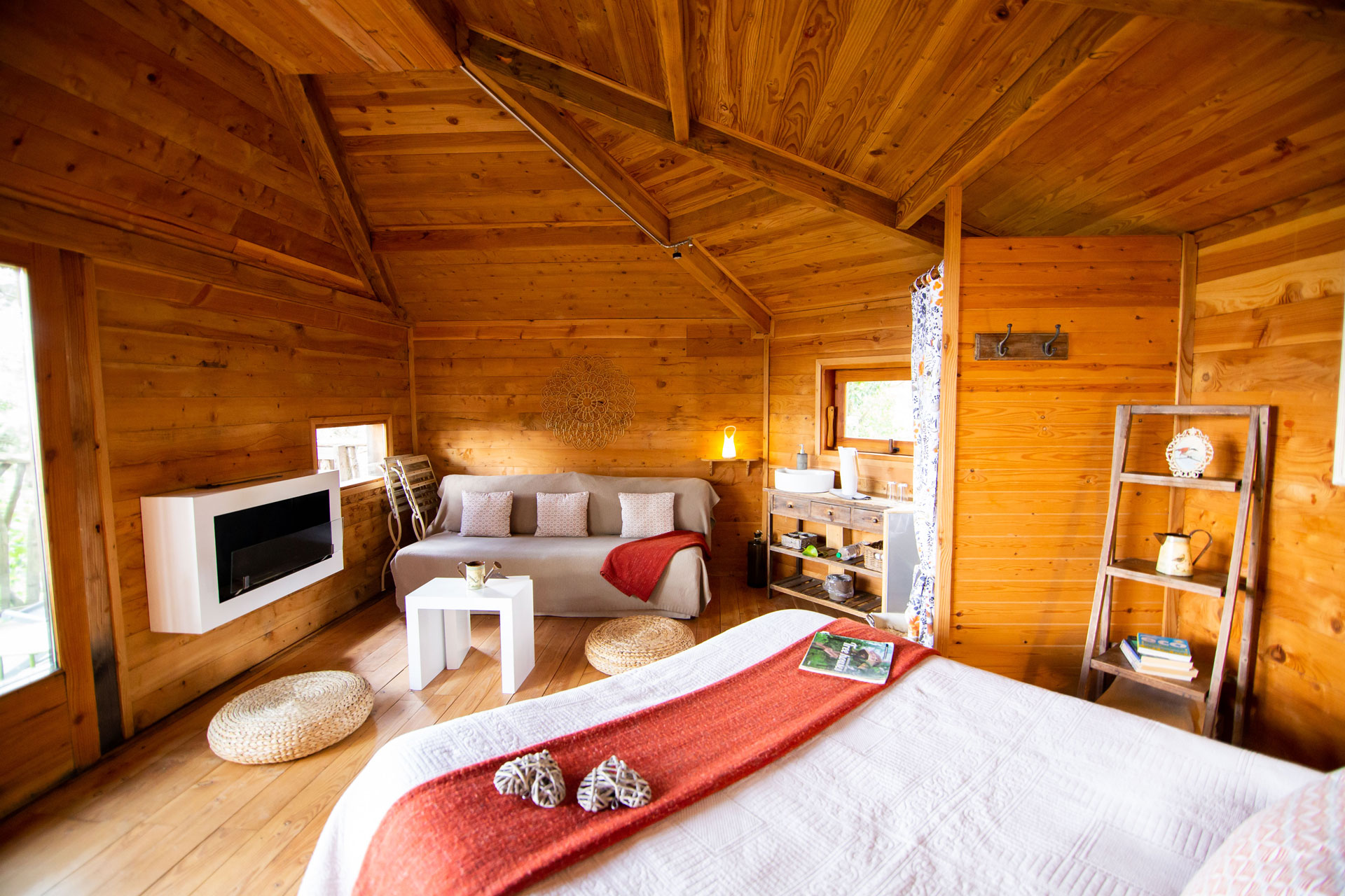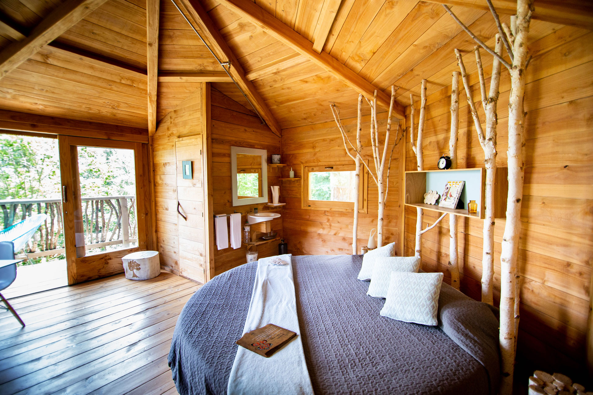 As cabanas ficam imersas na incrível floresta de Sant Hilari Sacalm. São 16 tipos de casas, que acomodam de 2 a 4 hóspedes e ficam de 3 a 15 metros de altura do chão! Adaptadas ao tamanho da árvore que as sustenta, as cabines têm formato octogonal e área média de 30 m2. Os terraços tem 10 m2 e oferece um espaço de descanso e relaxamento, para aproveitar ao máximo o ambiente da floresta com uma vista espetacular. É possível acessar a casa por meio de uma ponte ou escada vertical.