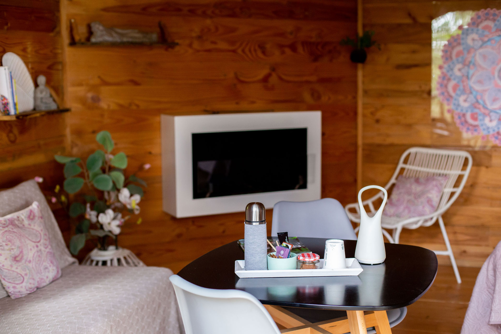 Lareira ecológica: Lareira montada na parede para jantares e noites de inverno. Ele usa bioetanol como combustível. É um tipo de álcool orgânico (vem da fermentação da beterraba e da cana-de-açúcar).