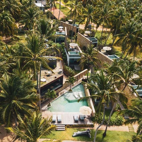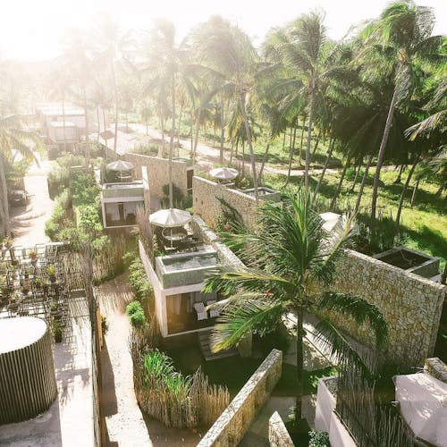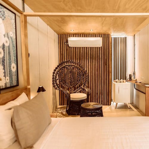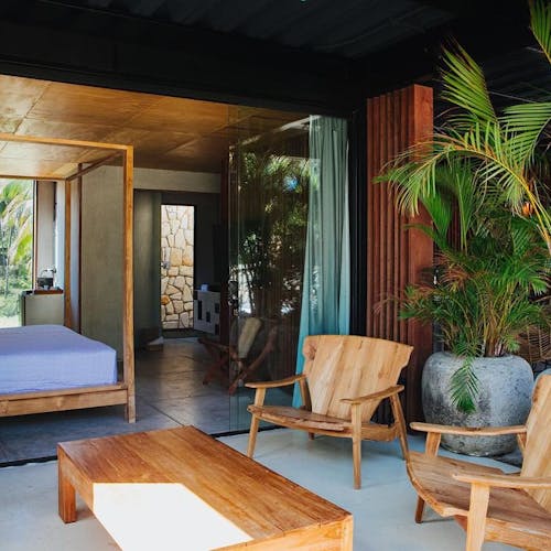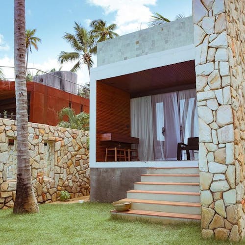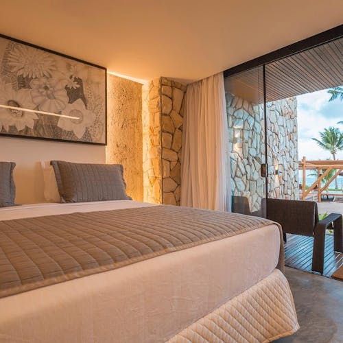 São dois tipos de suítes para 2 hóspedes: Bangalô Frente Mar e Bangalô Vista Mar, ambas de 75,35m2. O primeiro é mais exclusivo com apenas 2 bangalôs e o segundo com 5. Todos com cama king, rooftop individual, varanda, máquina de café, piscinas privativas e vista pro mar.