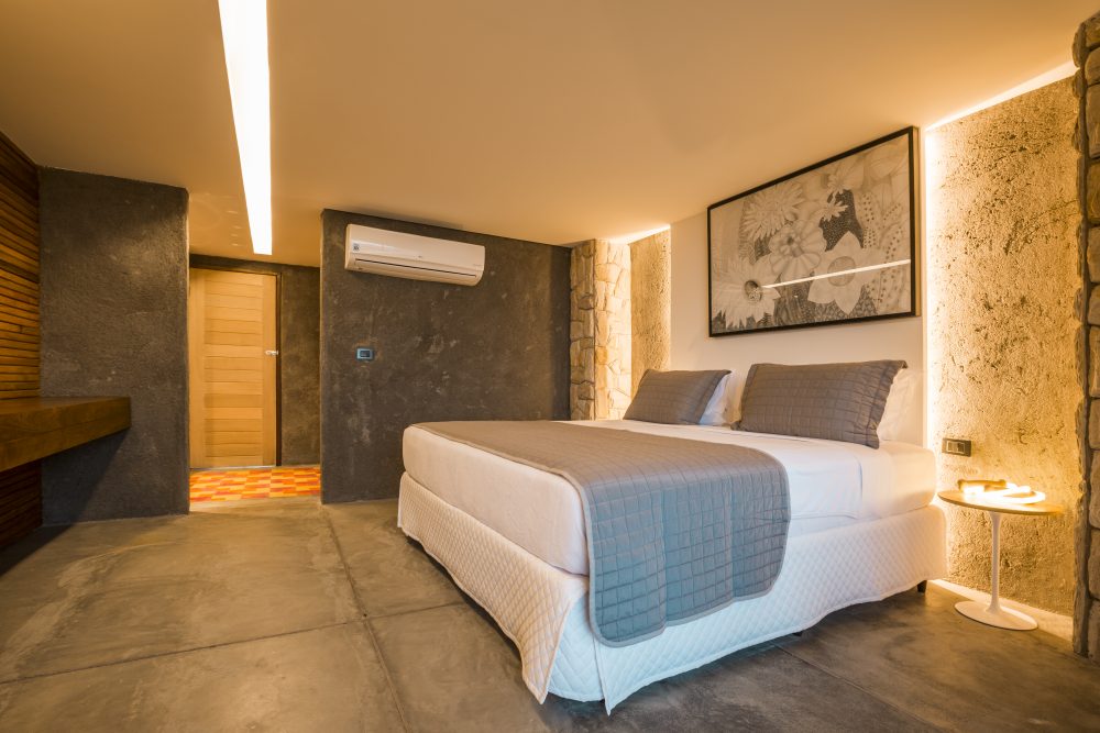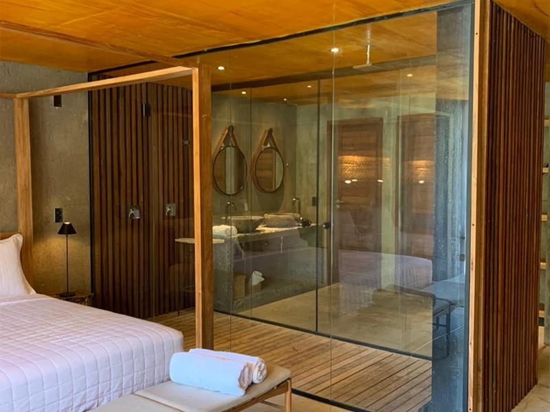 O hotel é exclusivo, conta apenas com 7 suítes! Por lá a natureza vive em sintonia com a modernidade - no projeto do hotel, foram incorporados elementos arrojados à paisagem. Os revestimentos de pedra, madeira e aço Corten, compõem a estrutura juntamente a itens como placas metálicas e vidro.
