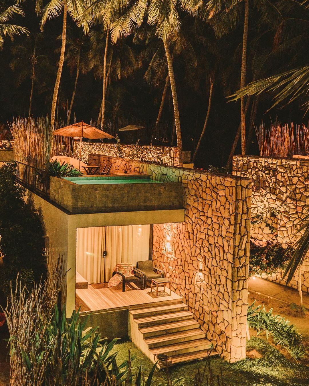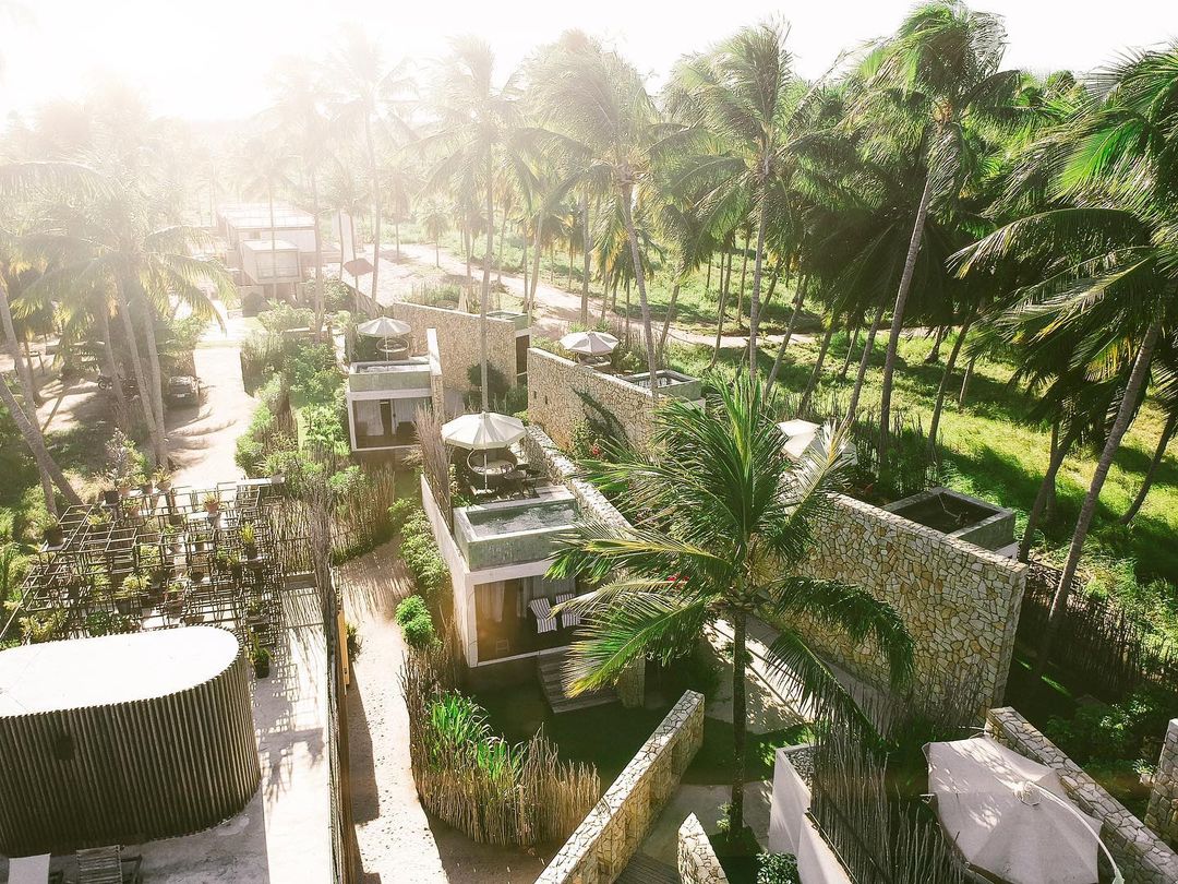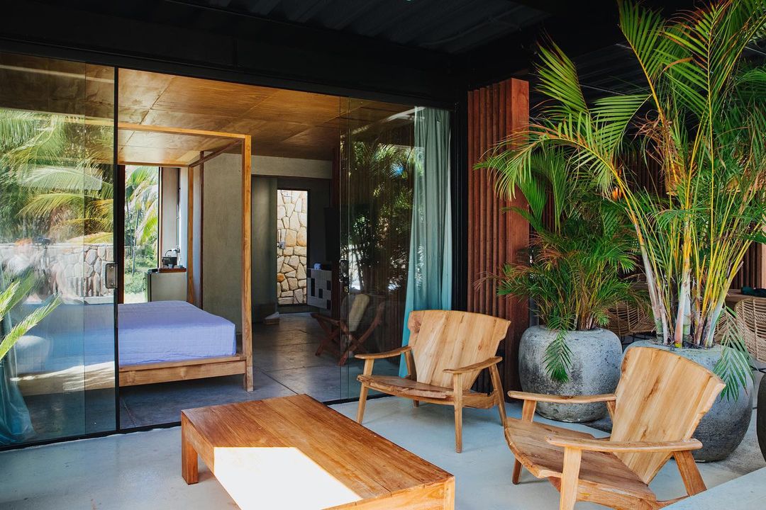 São dois tipos de suítes para 2 hóspedes: Bangalô Frente Mar e Bangalô Vista Mar, ambas de 75,35m2. O primeiro é mais exclusivo com apenas 2 bangalôs e o segundo com 5. Todos com cama king, rooftop individual, varanda, máquina de café, piscinas privativas e vista pro mar.