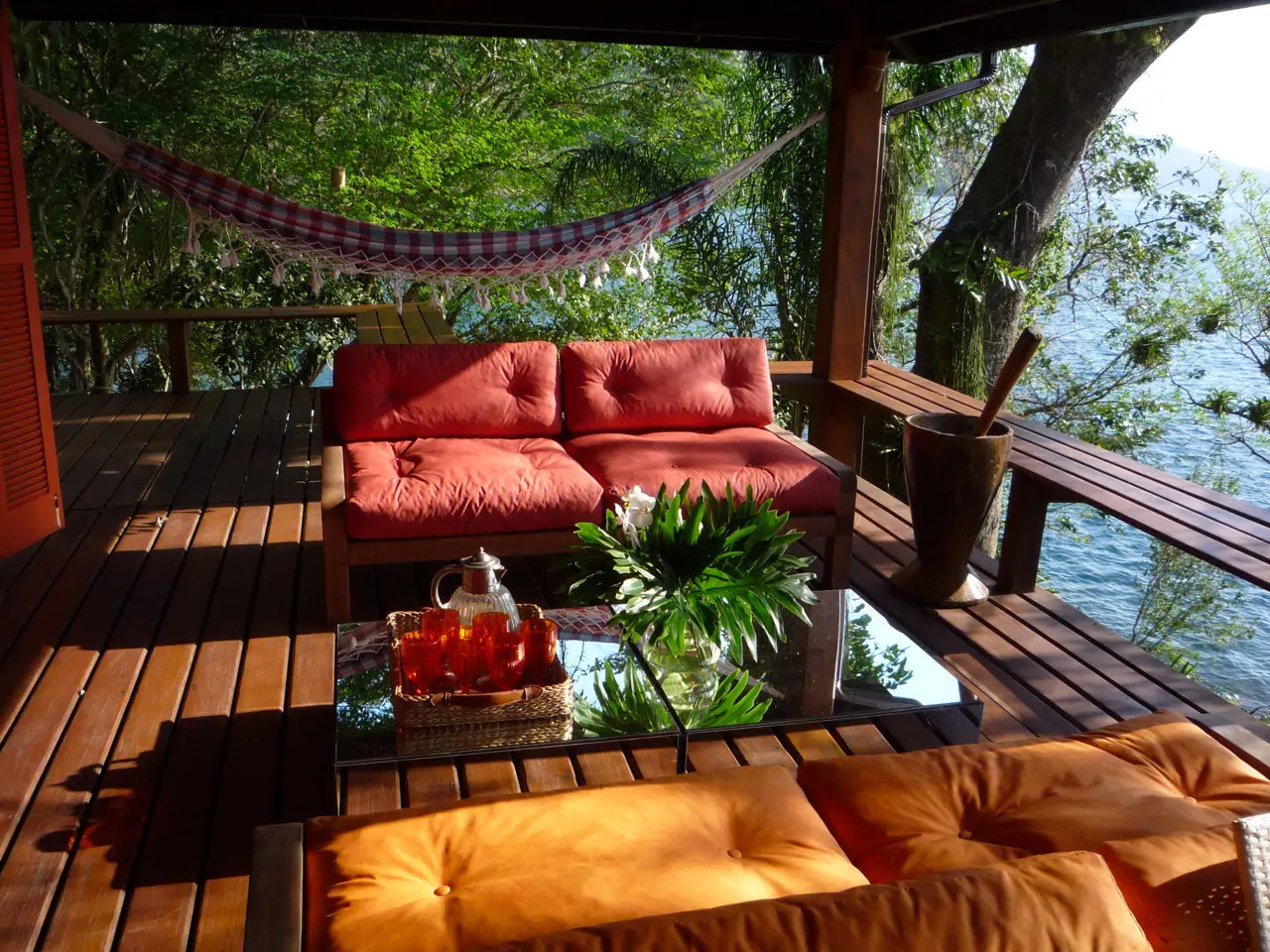 A casa que fica no local também é composta por três decks: dois de madeira equipados para aproveitar o sol durante o dia e o pôr do sol. Um deck de pedra para desfrutar de água na cintura e churrascos. Caiaques estão disponíveis para explorar os arredores. 4 redes brasileiras penduradas na varanda pra você descansar na sombra. O terceiro deck é de ancoragem.