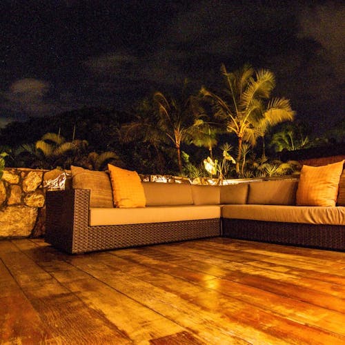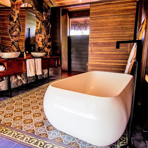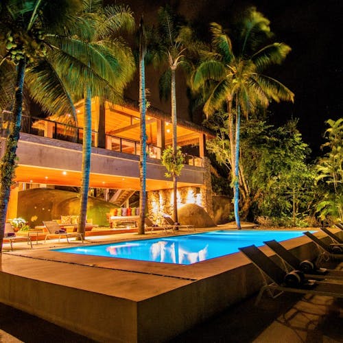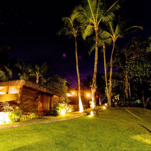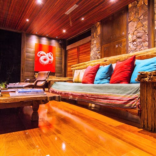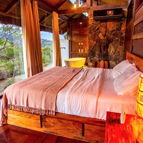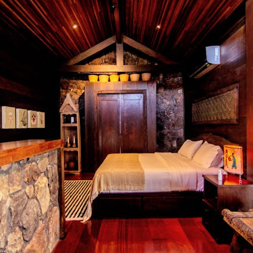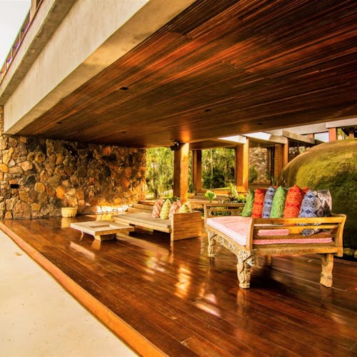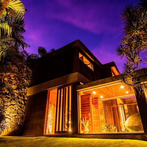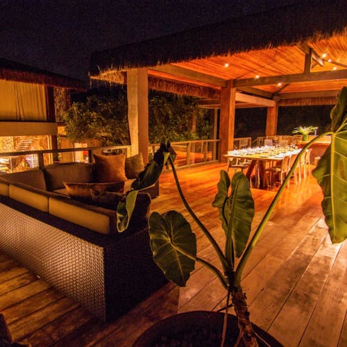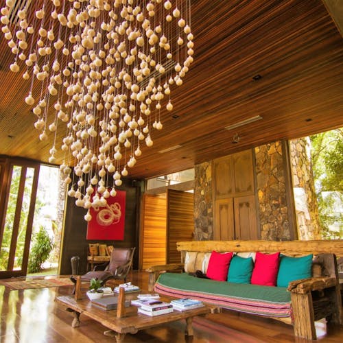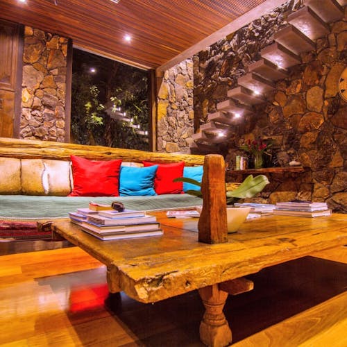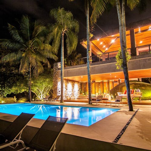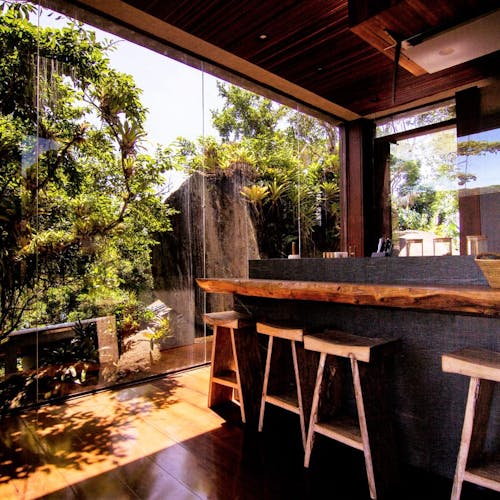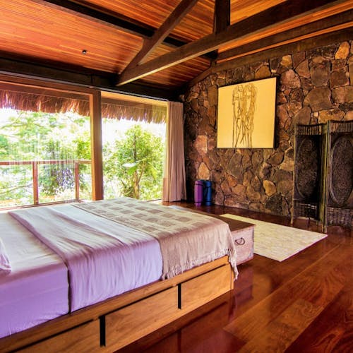 As suítes principais possuem madeiras nobres brasileiras e balinesas do chão ao teto, com paredes e móveis de pedra. Uma cozinha moderna e uma sala de estar aconchegante e repleta de arte complementam os quartos elegantes. Ao lado da villa, há três bangalôs em plano aberto com vista para o mar, cada um com uma cama king size e banheiro, conectados por caminhos à casa principal. A villa dispõe de um terraço para refeições ao ar livre com churrasqueira e se estende a uma grande piscina com deck ao ar livre.