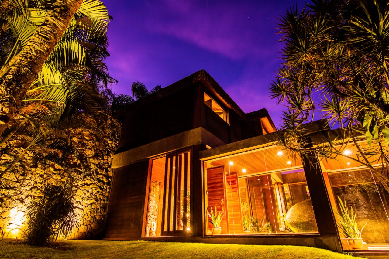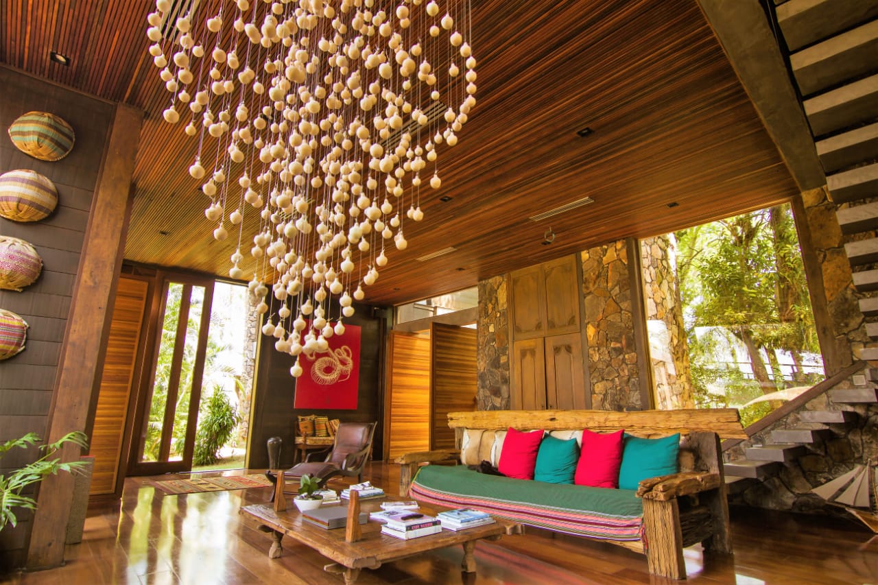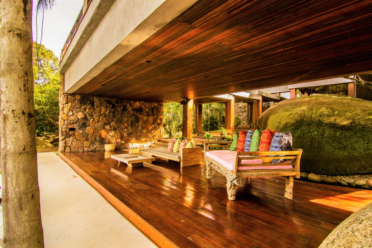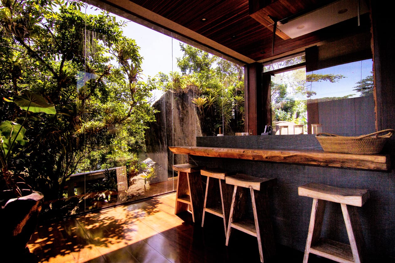 As suítes principais possuem madeiras nobres brasileiras e balinesas do chão ao teto, com paredes e móveis de pedra. Uma cozinha moderna e uma sala de estar aconchegante e repleta de arte complementam os quartos elegantes. Ao lado da villa, há três bangalôs em plano aberto com vista para o mar, cada um com uma cama king size e banheiro, conectados por caminhos à casa principal. A villa dispõe de um terraço para refeições ao ar livre com churrasqueira e se estende a uma grande piscina com deck ao ar livre.