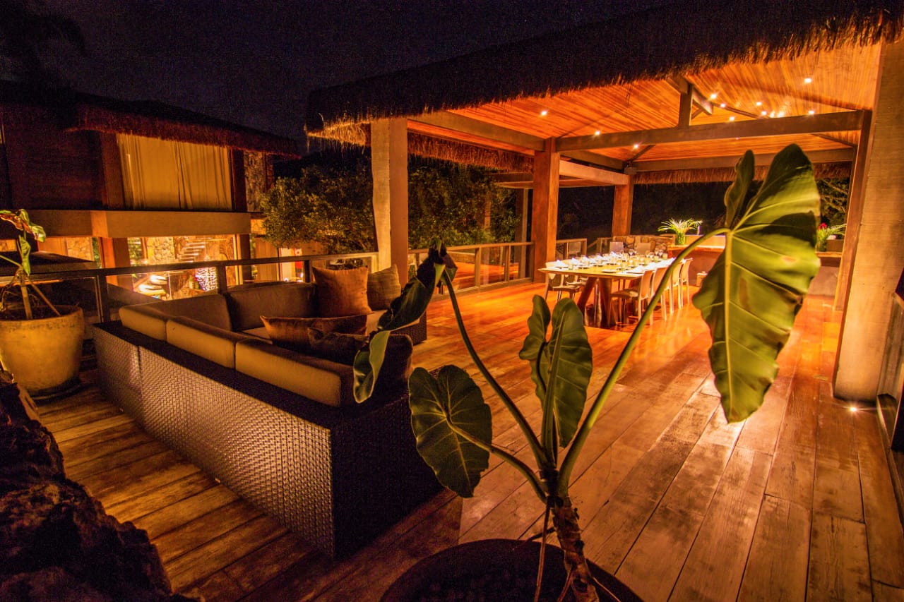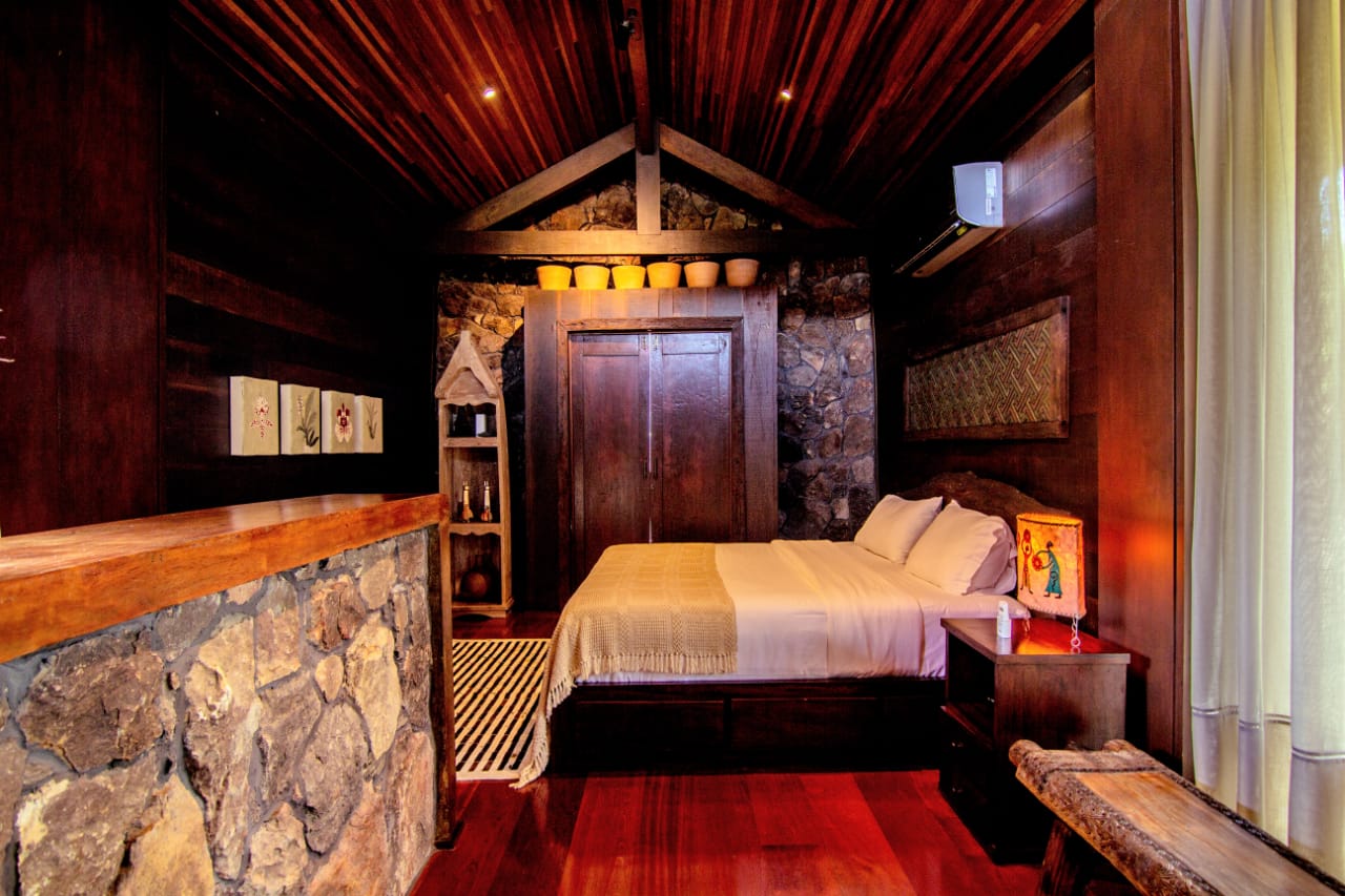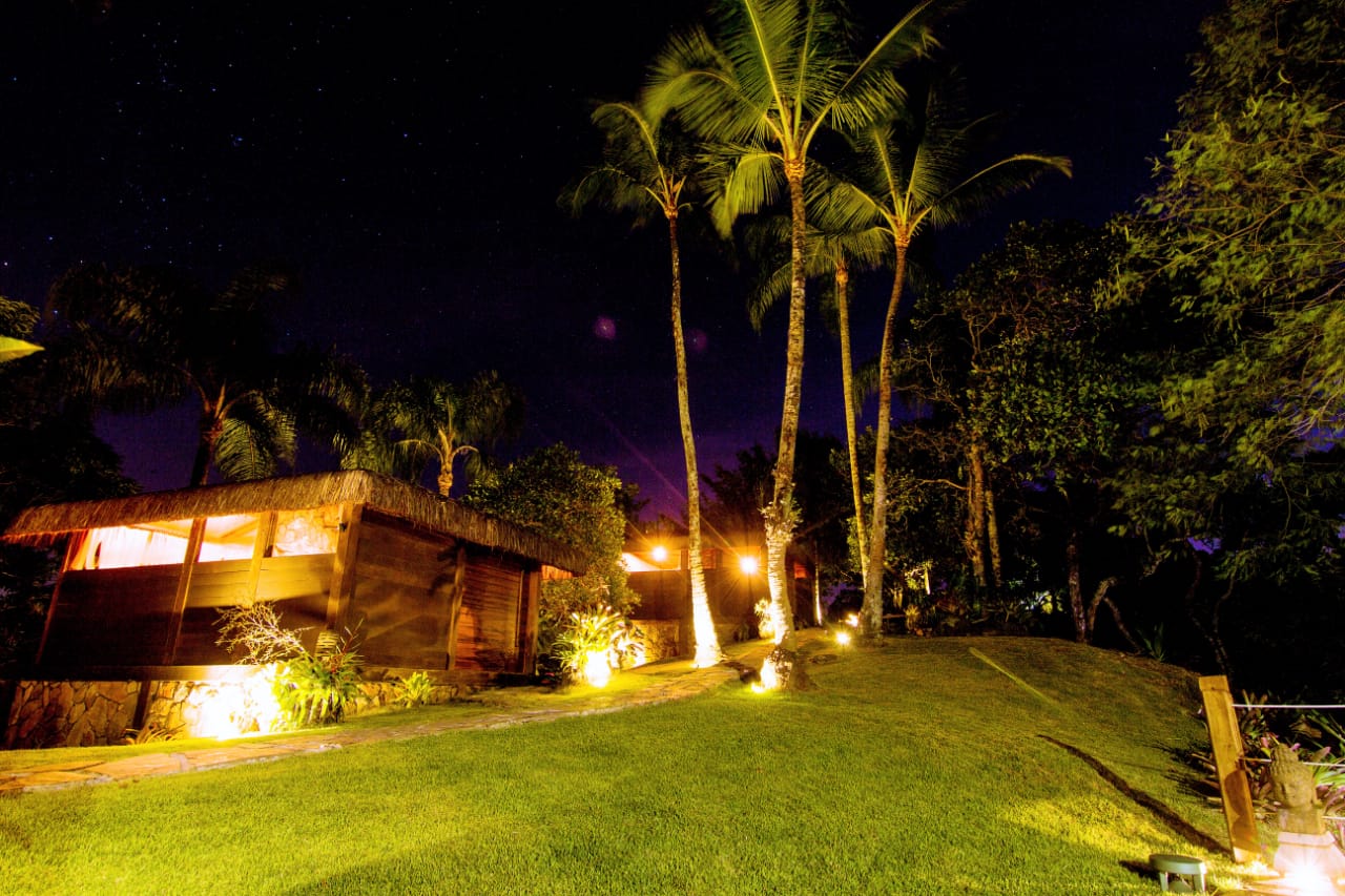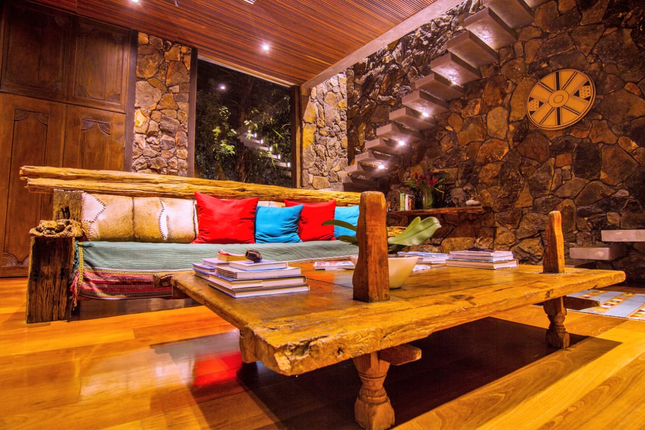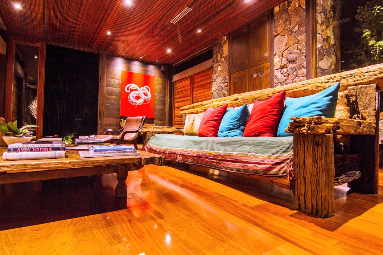 As suítes principais possuem madeiras nobres brasileiras e balinesas do chão ao teto, com paredes e móveis de pedra. Uma cozinha moderna e uma sala de estar aconchegante e repleta de arte complementam os quartos elegantes. Ao lado da villa, há três bangalôs em plano aberto com vista para o mar, cada um com uma cama king size e banheiro, conectados por caminhos à casa principal. A villa dispõe de um terraço para refeições ao ar livre com churrasqueira e se estende a uma grande piscina com deck ao ar livre.