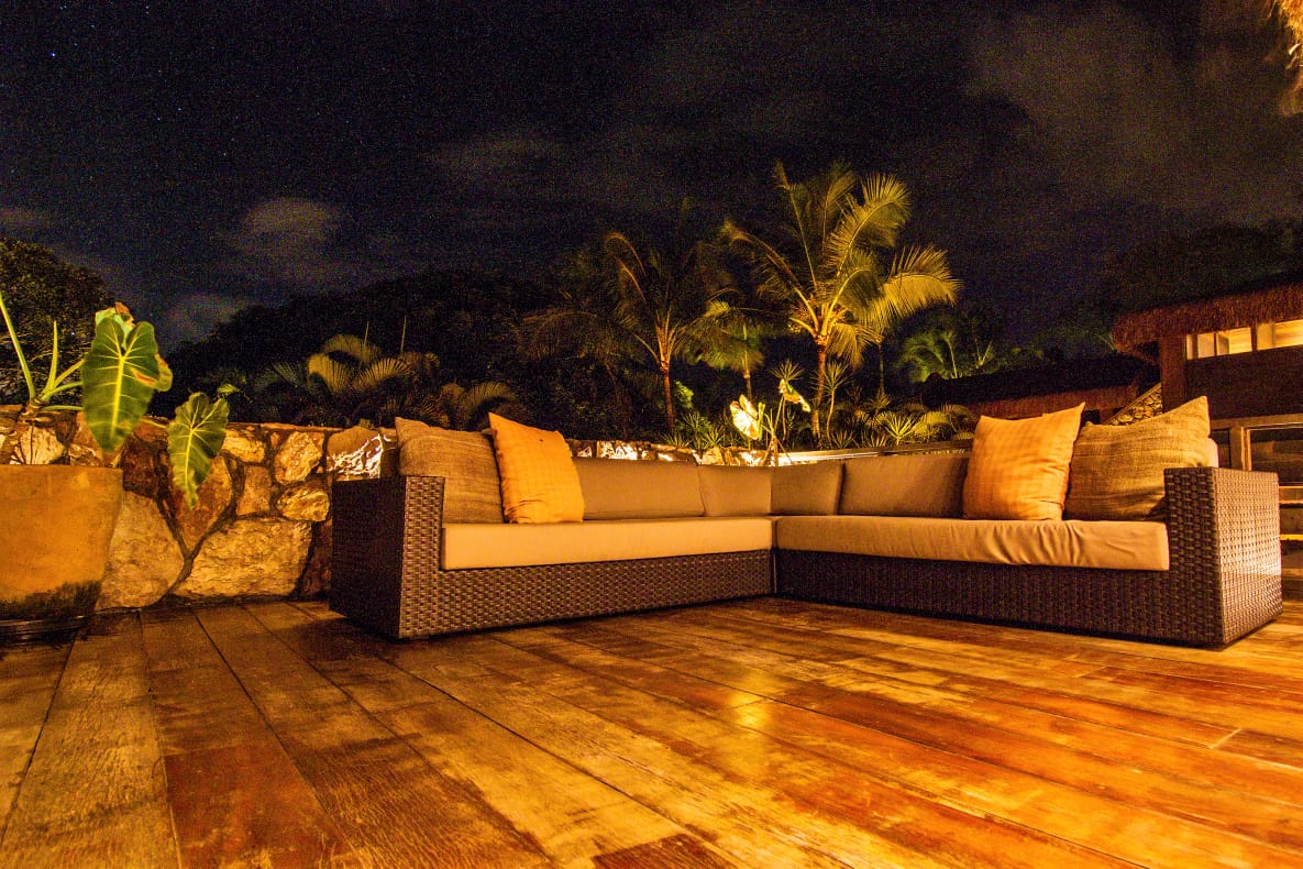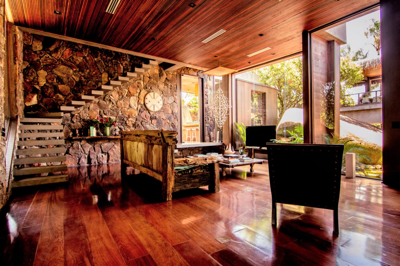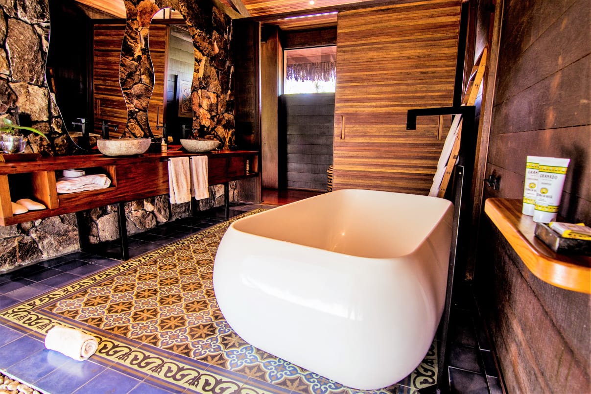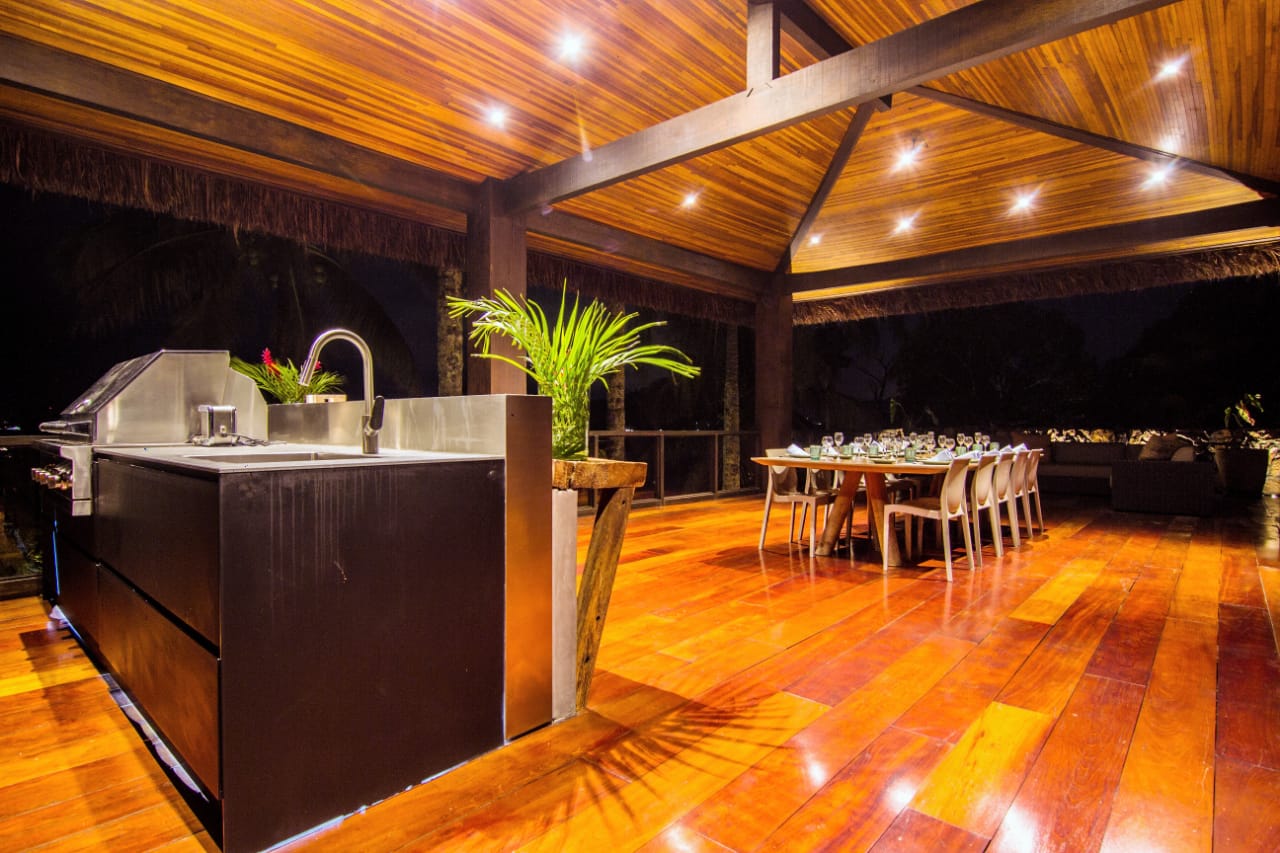 As suítes principais possuem madeiras nobres brasileiras e balinesas do chão ao teto, com paredes e móveis de pedra. Uma cozinha moderna e uma sala de estar aconchegante e repleta de arte complementam os quartos elegantes. Ao lado da villa, há três bangalôs em plano aberto com vista para o mar, cada um com uma cama king size e banheiro, conectados por caminhos à casa principal. A villa dispõe de um terraço para refeições ao ar livre com churrasqueira e se estende a uma grande piscina com deck ao ar livre.