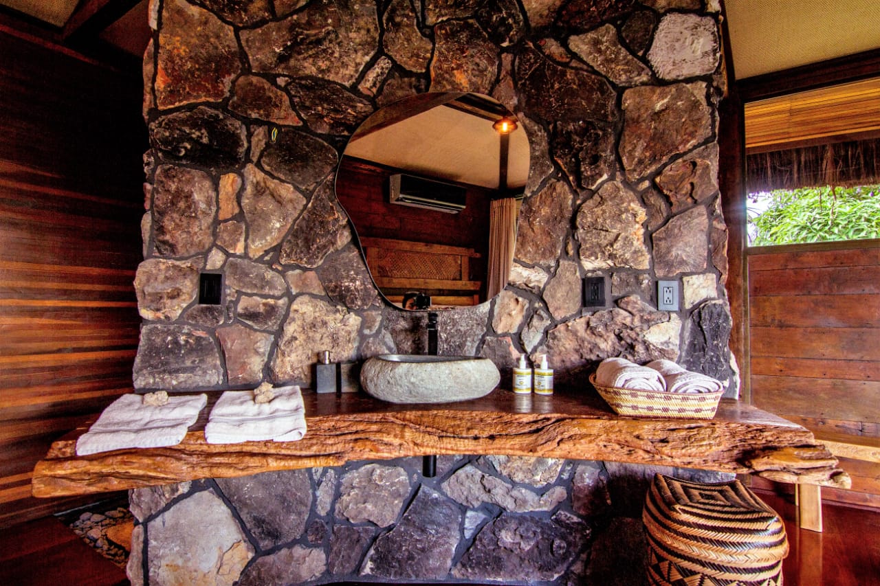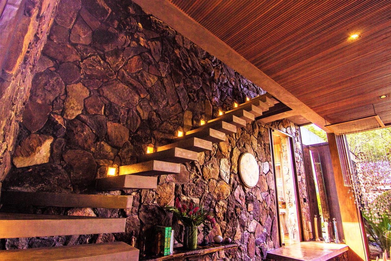 A experiência já começa do alto ao avistar bolsões intocados de areia branca e florestas tropicais exuberantes abraçando a costa íngreme mantendo a ilha e a casa envolta em um ar de mistério.