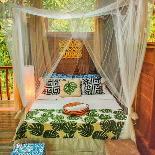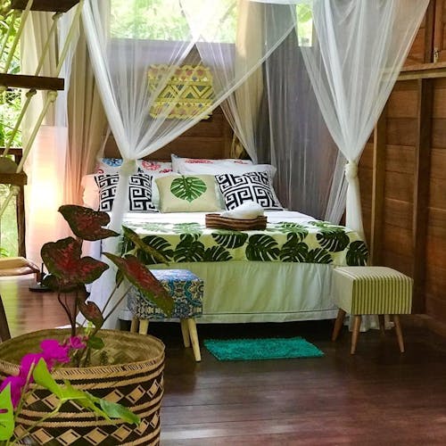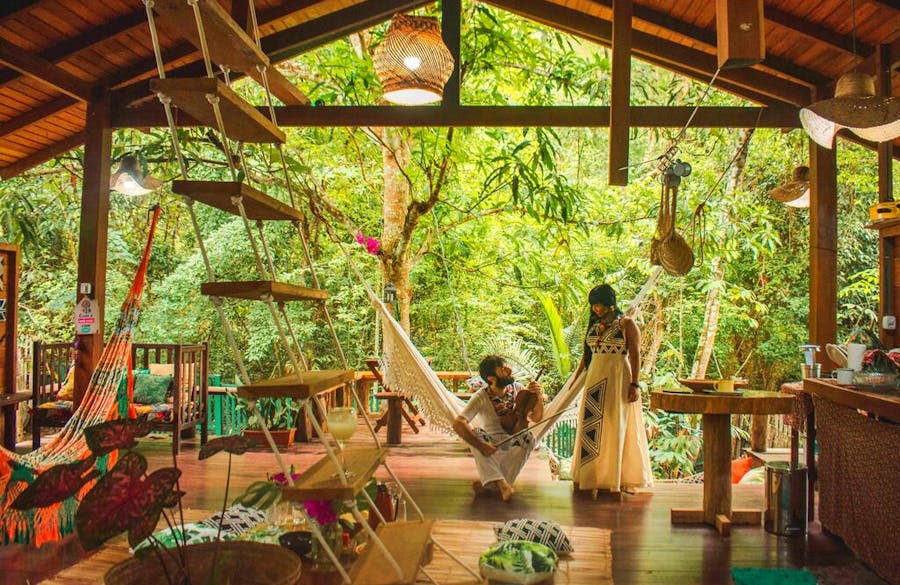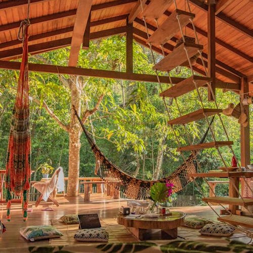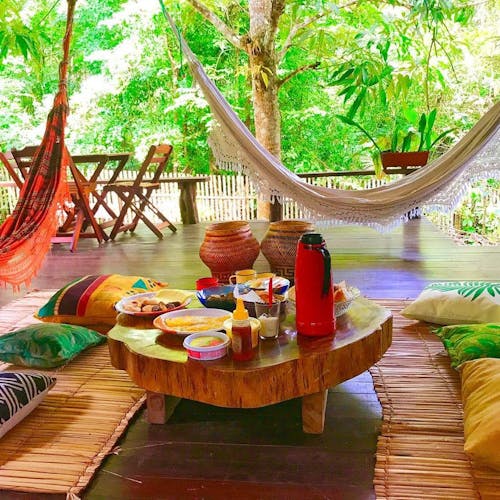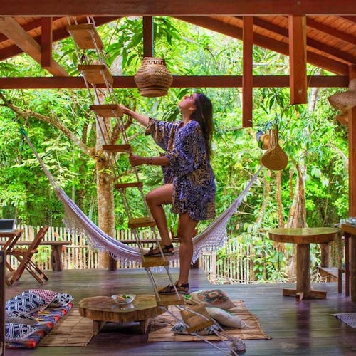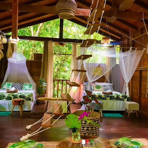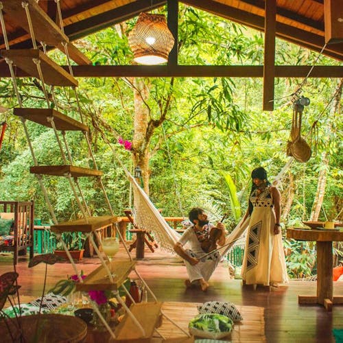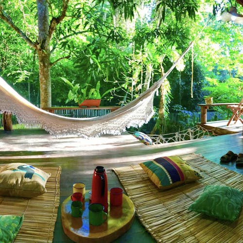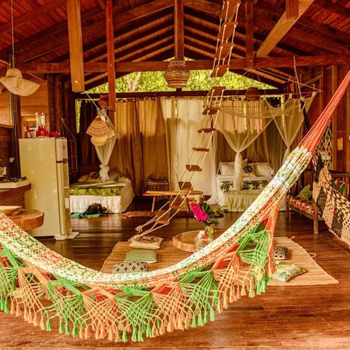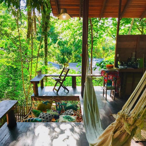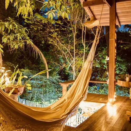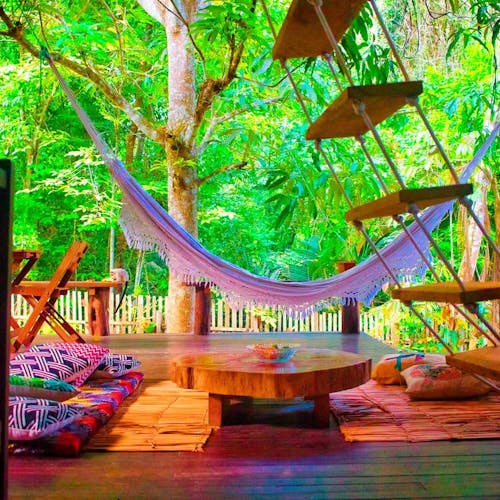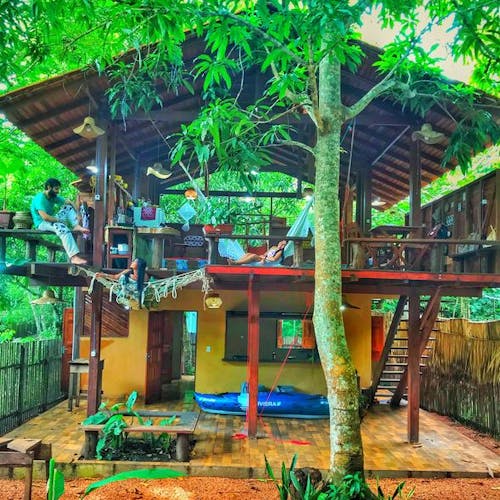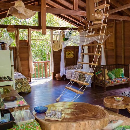 Uma casa na árvore diferente e cultural sem estar necessariamente nas alturas. Os proprietários recebem os hóspedes que terão a experiência de contato abundante com a natureza. A 50 metros da praia e com um terraço ao ar livre.