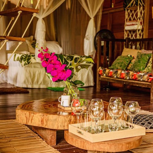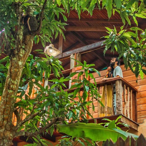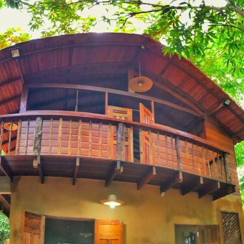 Feita de madeira nobre e toda aberta para a floresta, possui dois andares, estilo rústico e ao mesmo tempo charmoso e repleto de plantas. Há um mirante no 3o andar, feito para ficar na rede olhando a mata. Uma varanda rodeia toda a casa, em contato direto com a natureza e as árvores.